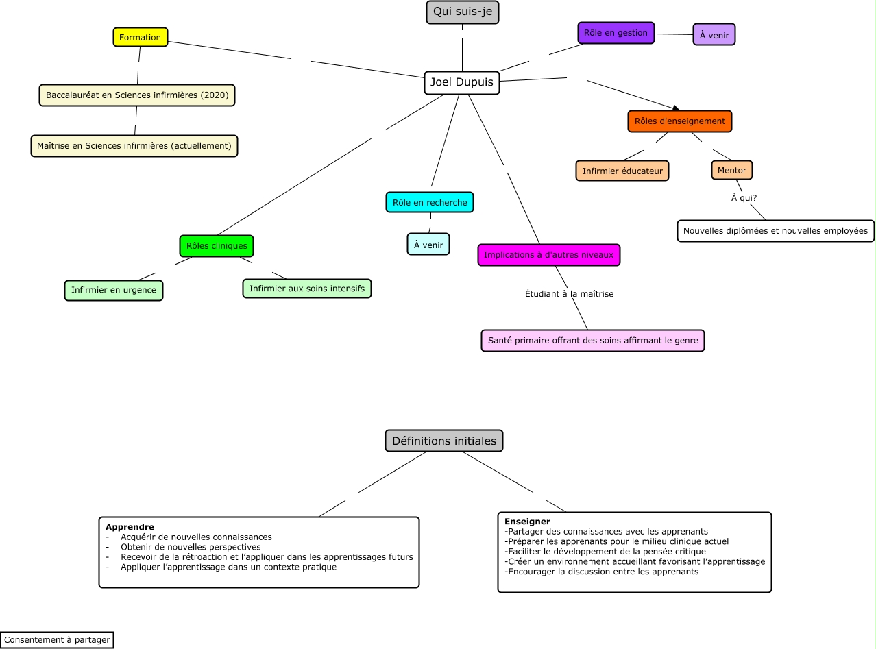 This Concept Map, created with IHMC CmapTools, has information related to: Qui-suis je_Joel Dupuis, Rôles d'enseignement ???? Infirmier éducateur, Qui suis-je ???? Joel Dupuis, Définitions initiales ???? Apprendre - Acquérir de nouvelles connaissances - Obtenir de nouvelles perspectives - Recevoir de la rétroaction et l’appliquer dans les apprentissages futurs - Appliquer l’apprentissage dans un contexte pratique, Rôles cliniques ???? Infirmier en urgence, Rôle en gestion ???? Joel Dupuis, Rôle en gestion ???? À venir, Mentor À qui? Nouvelles diplômées et nouvelles employées, Formation ???? Baccalauréat en Sciences infirmières (2020), Joel Dupuis ???? Rôle en recherche, Rôle en recherche ???? À venir, Baccalauréat en Sciences infirmières (2020) ???? Maîtrise en Sciences infirmières (actuellement), Joel Dupuis ???? Rôles cliniques, Joel Dupuis ???? Implications à d'autres niveaux, Rôles cliniques ???? Infirmier aux soins intensifs, Implications à d'autres niveaux Étudiant à la maîtrise Santé primaire offrant des soins affirmant le genre, Définitions initiales ???? Enseigner - Partager des connaissances avec les apprenants - Préparer les apprenants pour le milieu clinique actuel - Faciliter le développement de la pensée critique - Créer un environnement accueillant favorisant l’apprentissage - Encourager la discussion entre les apprenants, Joel Dupuis ???? Rôles d'enseignement, Formation ???? Joel Dupuis, Rôles d'enseignement ???? Mentor
