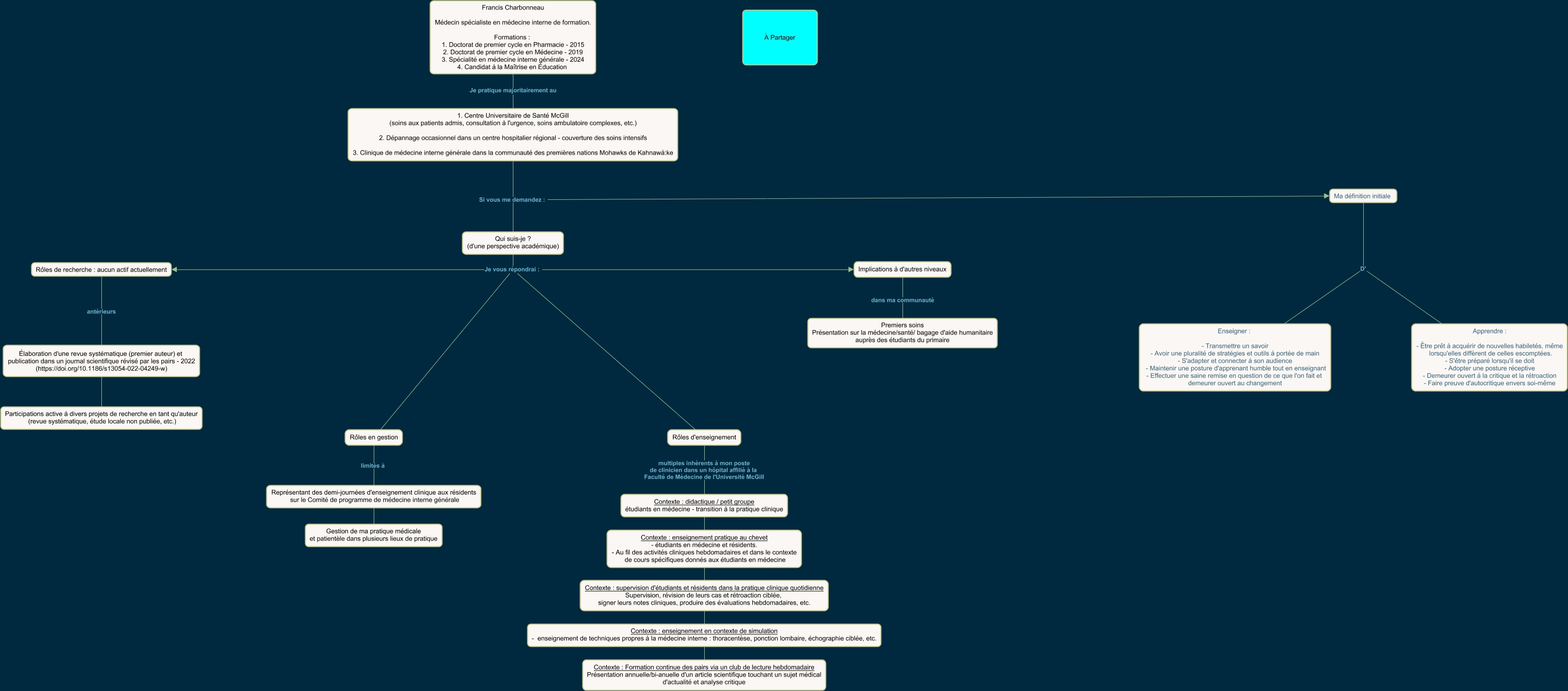 This Concept Map, created with IHMC CmapTools, has information related to: Quisuisje_F Charbonneau, Rôles d'enseignement multiples inhérents à mon poste de clinicien dans un hôpital affilié à la Faculté de Médecine de l'Université McGill Contexte : didactique / petit groupe étudiants en médecine - transition à la pratique clinique, Rôles en gestion limités à Gestion de ma pratique médicale et patientèle dans plusieurs lieux de pratique, Qui suis-je ? (d'une perspective académique) Je vous répondrai : Rôles en gestion, 1. Centre Universitaire de Santé McGill (soins aux patients admis, consultation à l'urgence, soins ambulatoire complexes, etc.) 2. Dépannage occasionnel dans un centre hospitalier régional - couverture des soins intensifs 3. Clinique de médecine interne générale dans la communauté des premières nations Mohawks de Kahnawà:ke Si vous me demandez : Ma définition initiale, Ma définition initiale D' Enseigner : - Transmettre un savoir - Avoir une pluralité de stratégies et outils à portée de main - S'adapter et connecter à son audience - Maintenir une posture d'apprenant humble tout en enseignant - Effectuer une saine remise en question de ce que l'on fait et demeurer ouvert au changement, Rôles d'enseignement multiples inhérents à mon poste de clinicien dans un hôpital affilié à la Faculté de Médecine de l'Université McGill Contexte : supervision d'étudiants et résidents dans la pratique clinique quotidienne Supervision, révision de leurs cas et rétroaction ciblée, signer leurs notes cliniques, produire des évaluations hebdomadaires, etc., Francis Charbonneau Médecin spécialiste en médecine interne de formation. Formations : 1. Doctorat de premier cycle en Pharmacie - 2015 2. Doctorat de premier cycle en Médecine - 2019 3. Spécialité en médecine interne générale - 2024 4. Candidat à la Maîtrise en Éducation Je pratique majoritairement au 1. Centre Universitaire de Santé McGill (soins aux patients admis, consultation à l'urgence, soins ambulatoire complexes, etc.) 2. Dépannage occasionnel dans un centre hospitalier régional - couverture des soins intensifs 3. Clinique de médecine interne générale dans la communauté des premières nations Mohawks de Kahnawà:ke, Qui suis-je ? (d'une perspective académique) Je vous répondrai : Rôles d'enseignement, Implications à d'autres niveaux dans ma communauté Premiers soins Présentation sur la médecine/santé/ bagage d'aide humanitaire auprès des étudiants du primaire, Rôles d'enseignement multiples inhérents à mon poste de clinicien dans un hôpital affilié à la Faculté de Médecine de l'Université McGill Contexte : enseignement pratique au chevet - étudiants en médecine et résidents. - Au fil des activités cliniques hebdomadaires et dans le contexte de cours spécifiques donnés aux étudiants en médecine, 1. Centre Universitaire de Santé McGill (soins aux patients admis, consultation à l'urgence, soins ambulatoire complexes, etc.) 2. Dépannage occasionnel dans un centre hospitalier régional - couverture des soins intensifs 3. Clinique de médecine interne générale dans la communauté des premières nations Mohawks de Kahnawà:ke Si vous me demandez : Qui suis-je ? (d'une perspective académique), Rôles d'enseignement multiples inhérents à mon poste de clinicien dans un hôpital affilié à la Faculté de Médecine de l'Université McGill Contexte : Formation continue des pairs via un club de lecture hebdomadaire Présentation annuelle/bi-anuelle d'un article scientifique touchant un sujet médical d'actualité et analyse critique, Qui suis-je ? (d'une perspective académique) Je vous répondrai : Rôles de recherche : aucun actif actuellement, Rôles d'enseignement multiples inhérents à mon poste de clinicien dans un hôpital affilié à la Faculté de Médecine de l'Université McGill Contexte : enseignement en contexte de simulation - enseignement de techniques propres à la médecine interne : thoracentèse, ponction lombaire, échographie ciblée, etc., Ma définition initiale D' Apprendre : - Être prêt à acquérir de nouvelles habiletés, même lorsqu'elles diffèrent de celles escomptées. - S'être préparé lorsqu'il se doit - Adopter une posture réceptive - Demeurer ouvert à la critique et la rétroaction - Faire preuve d'autocritique envers soi-même, Rôles de recherche : aucun actif actuellement antérieurs Élaboration d'une revue systématique (premier auteur) et publication dans un journal scientifique révisé par les pairs - 2022 (https://doi.org/10.1186/s13054-022-04249-w), Qui suis-je ? (d'une perspective académique) Je vous répondrai : Implications à d'autres niveaux, Rôles de recherche : aucun actif actuellement antérieurs Participations active à divers projets de recherche en tant qu'auteur (revue systématique, étude locale non publiée, etc.), Rôles en gestion limités à Représentant des demi-journées d'enseignement clinique aux résidents sur le Comité de programme de médecine interne générale