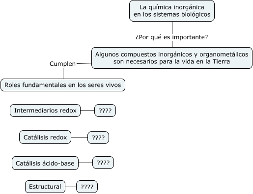 Este Cmap, tiene información relacionada con: Bioinorgánica 1, La química inorgánica en los sistemas biológicos ¿Por qué es importante? Algunos compuestos inorgánicos y organometálicos son necesarios para la vida en la Tierra, Algunos compuestos inorgánicos y organometálicos son necesarios para la vida en la Tierra Cumplen Roles fundamentales en los seres vivos, Catálisis redox ???? ????, Catálisis ácido-base ???? ????, Estructural ???? ????, Intermediarios redox ???? ????