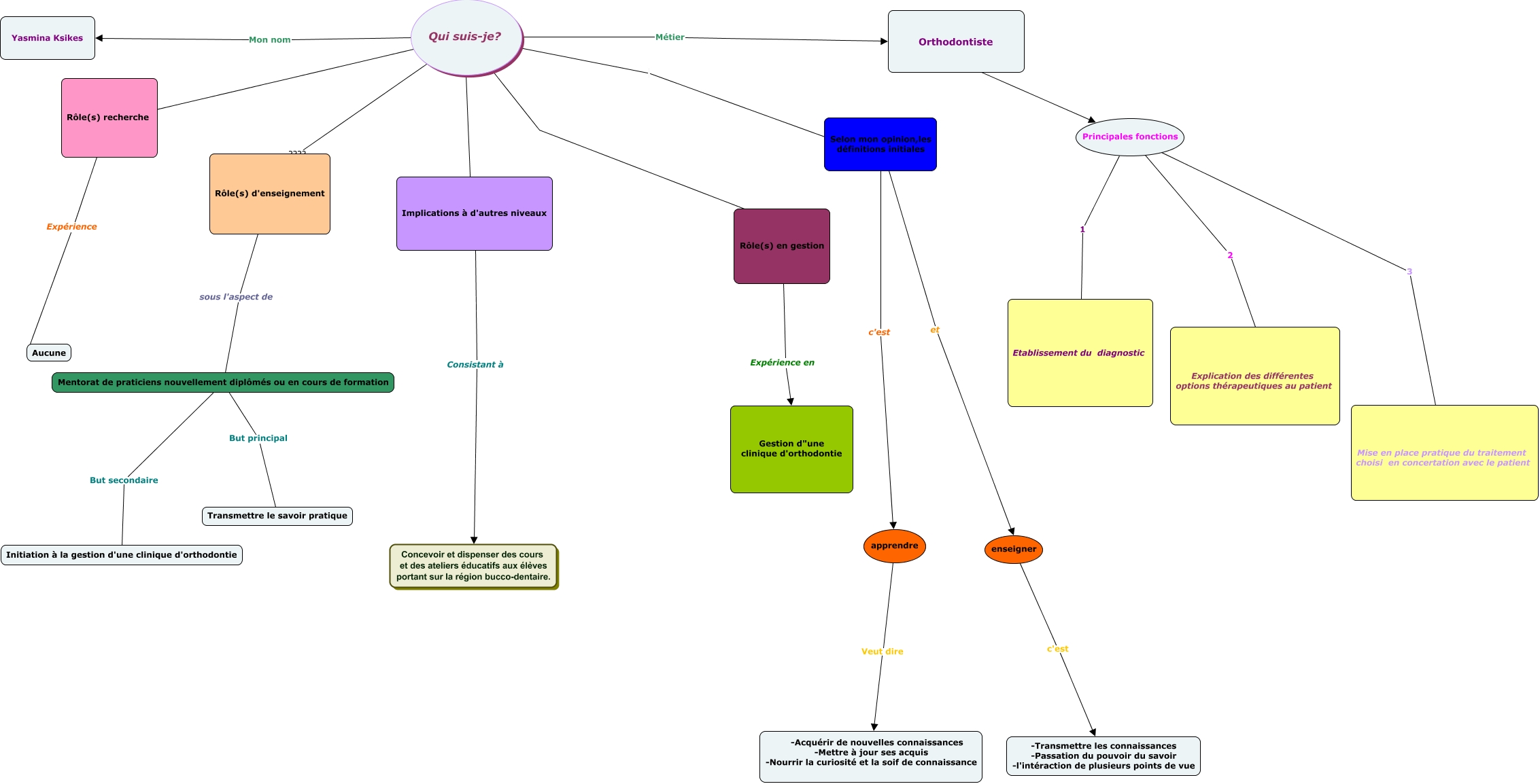 Cette carte de concepts créée avec IHMC CmapTools traite de: Yasmina-Présentation, Rôle(s) recherche Expérience Aucune, Implications à d'autres niveaux ???? Qui suis-je?, Principales fonctions 3 Mise en place pratique du traitement choisi en concertation avec le patient, Principales fonctions 2 Explication des différentes options thérapeutiques au patient, Rôle(s) d'enseignement sous l'aspect de Mentorat de praticiens nouvellement diplômés ou en cours de formation, Mentorat de praticiens nouvellement diplômés ou en cours de formation But principal Transmettre le savoir pratique, Implications à d'autres niveaux Consistant à Concevoir et dispenser des cours et des ateliers éducatifs aux élèves portant sur la région bucco-dentaire., Qui suis-je? ???? Rôle(s) en gestion, Qui suis-je? ???? Rôle(s) recherche, Qui suis-je? Métier Orthodontiste, apprendre Veut dire -Acquérir de nouvelles connaissances -Mettre à jour ses acquis -Nourrir la curiosité et la soif de connaissance, Selon mon opinion,les définitions initiales c'est apprendre, Orthodontiste ???? Principales fonctions, Mentorat de praticiens nouvellement diplômés ou en cours de formation But secondaire Initiation à la gestion d'une clinique d'orthodontie, Principales fonctions 1 Etablissement du diagnostic, Qui suis-je? ????, Qui suis-je? Mon nom Yasmina Ksikes, Rôle(s) en gestion Expérience en Gestion d"une clinique d'orthodontie, Qui suis-je? ???? Rôle(s) d'enseignement, enseigner c'est -Transmettre les connaissances -Passation du pouvoir du savoir -l'intéraction de plusieurs points de vue