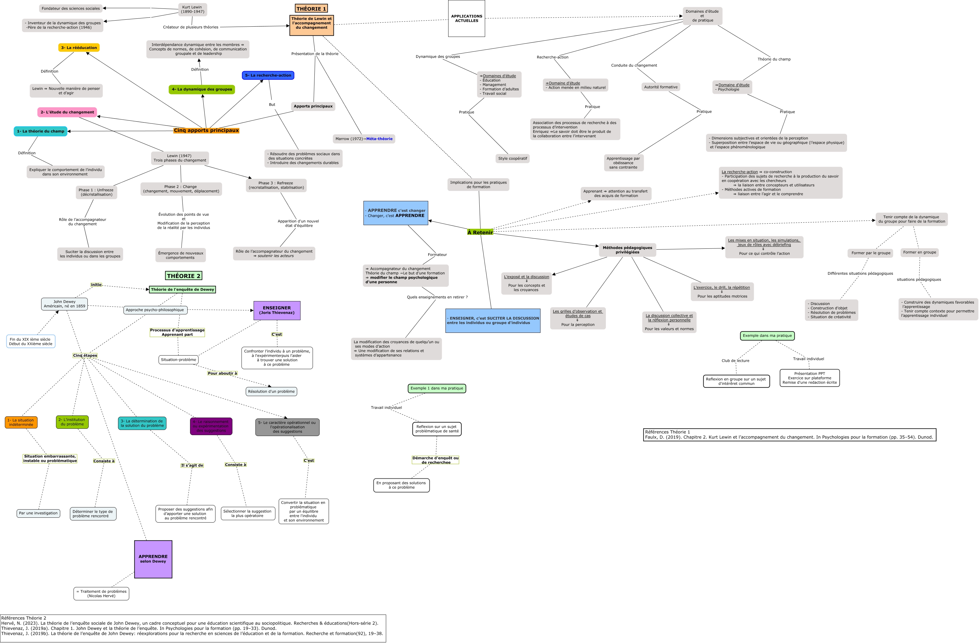 Cette carte de concepts créée avec IHMC CmapTools traite de: Gueu Sylvain_Lewin_L’accompagnement du changement, Apports principaux Cinq apports principaux 2- L’étude du changement, ENSEIGNER (Joris Thievenaz) C'est Confronter l’individu à un problème, à l'expérimenterpuis l'aider à trouver une solution à ce problème, 1- La théorie du champ Définition Expliquer le comportement de l’individu dans son environnement, John Dewey Américain, né en 1859 APPRENDRE selon Dewey = Traitement de problèmes (Nicolas Hervé), Domaines d’étude et de pratique Recherche-action ⇒Domaine d'étude - Action menée en milieu naturel, Implications pour les pratiques de formation À Retenir Méthodes pédagogiques privilégiées, Reflexion sur un sujet problématique de santé Démarche d'enquêt ou de recherchee En proposant des solutions à ce problème, Théorie de l'enquête de Dewey Cinq étapes 3- La détermination de la solution du problème, ⇒ Accompagnateur du changement Théorie du champ →Le but d’une formation ⇒ modifier le champ psychologique d’une personne Quels enseignements en retirer ? La modification des croyances de quelqu’un ou ses modes d’action ⇒ Une modification de ses relations et systèmes d’appartenance, Méthodes pédagogiques privilégiées La discussion collective et la réflexion personnelle ⇓ Pour les valeurs et normes, 1- La situation indéterminée Situation embarrassante, instable ou problématique Par une investigation, Former en groupe situations pédagogiques - Construire des dynamiques favorables l’apprentissage - Tenir compte contexte pour permettre l’apprentissage individuel, 2- L’institution du problème Consiste à Déterminer le type de problème rencontré, Tenir compte de la dynamique du groupe pour faire de la formation Former en groupe, Kurt Lewin (1890-1947) Fondateur des sciences sociales, Lewin (1947) Trois phases du changement Phase 1 : Unfreeze (décristallisation), Implications pour les pratiques de formation À Retenir - ENSEIGNER, c’est SUCITER LA DISCUSSION entre les individus ou groupe d'individus, Phase 2 : Change (changement, mouvement, déplacement) Évolution des points de vue et Modification de la perception de la réalité par les individus Émergence de nouveaux comportements, Exemple 1 dans ma pratique Travail individuel Reflexion sur un sujet problématique de santé, 5- La recherche-action But - Résoudre des problèmes sociaux dans des situations concrètes - Introduire des changements durables