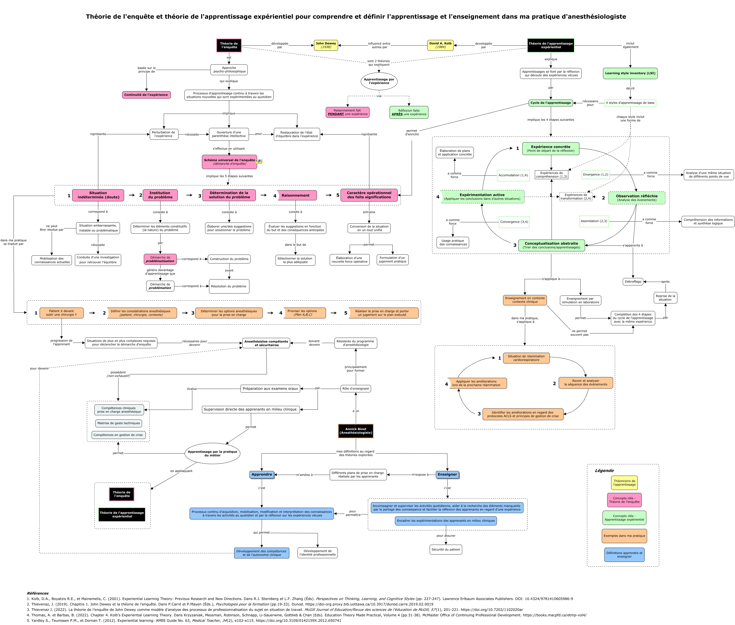 Cette carte de concepts créée avec IHMC CmapTools traite de: ThéorieEnquête_ApprentissageExpérientiel_AnnickBinet, Complétion des 4 étapes du cycle de l'apprentissage avec la même expérience par Reprise de la situation, Différents plans de prise en charge réalisés par les apprenants m'amène à Apprendre, Rôle d'enseignant par Supervision directe des apprenants en milieu clinique, Schème universel de l'enquête (démarche d'enquête) implique les 5 étapes suivantes, Enseignement en contexte contexte clinique ne permet souvent pas Complétion des 4 étapes du cycle de l'apprentissage avec la même expérience, Conceptualisation abstraite (Tirer des conclusions/apprentissages) Expérimentation active (Appliquer les conclusions dans d'autres situations), Convergence (3,4) a comme force Usage pratique des connaissances, Encadrer les expérimentations des apprenants en milieu cliniques pour assurer Sécurité du patient, Observation réfléchie (Analyse des évenements) s'apparente à Débreffage, Enseignement par simulation en laboratoire permet Complétion des 4 étapes du cycle de l'apprentissage avec la même expérience, Institution du problème consiste à Déterminer les éléments constitutifs (la nature) du problème, Évaluer les suggestions en fonction du but et des conséquences anticipées dans le but de Sélectionner la solution la plus adéquate, Perturbation de l'expérience nécessite Ouverture d'une parenthèse intellective, Approche psycho-philosophique basée sur le principe de Continuité de l'expérience, Théorie de l'enquête développée par John Dewey (1938), 4 styles d'apprentissage de base chaque style inclut une forme de Expériences de transformation (2,4), Processus d'apprentissage continu à travers les situations nouvelles qui sont expérimentées au quotidien implique Ouverture d'une parenthèse intellective, Conceptualisation abstraite (Tirer des conclusions/apprentissages) s'apparente à Débreffage, Conversion de la situation en un tout unifié permet Élaboration d'une nouvelle force opérative, Cycle de l'apprentissage implique les 4 étapes suivantes 1