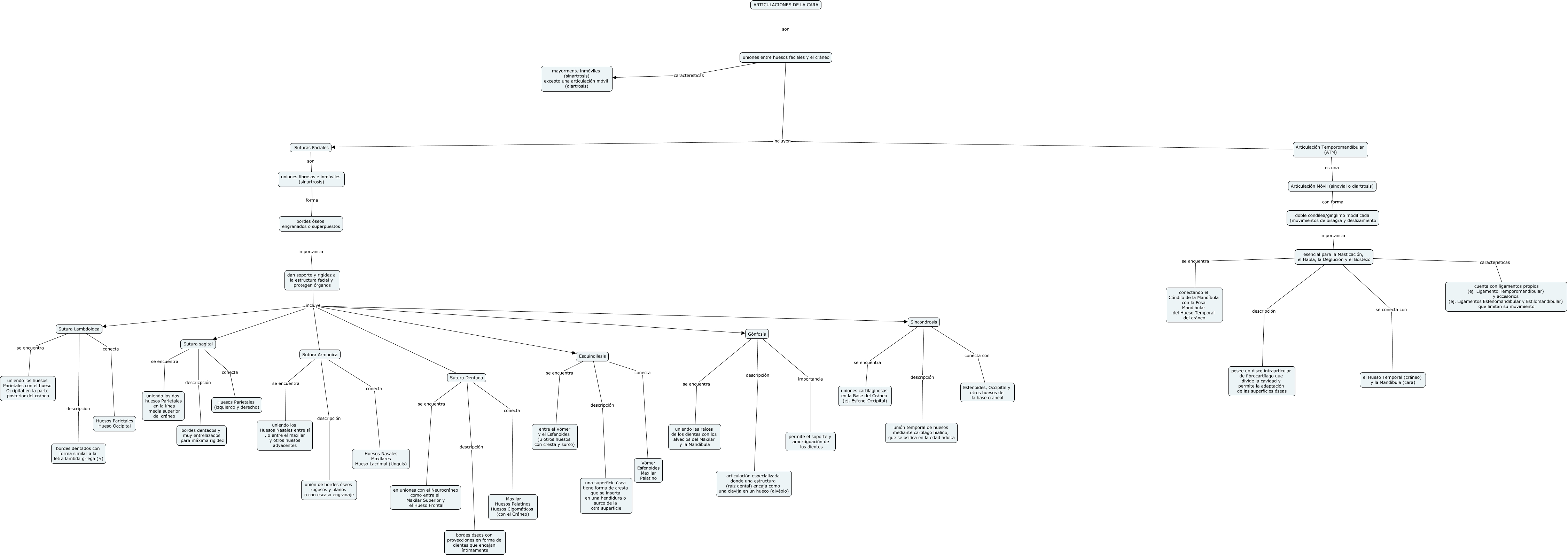 Este Cmap, tiene información relacionada con: Articulaciones de la cara Johan, Gónfosis descripción articulación especializada donde una estructura (raíz dental) encaja como una clavija en un hueco (alvéolo), Suturas Faciales son uniones fibrosas e inmóviles (sinartrosis), Esquindilesis se encuentra entre el Vómer y el Esfenoides (u otros huesos con cresta y surco), Sutura Dentada se encuentra en uniones con el Neurocráneo como entre el Maxilar Superior y el Hueso Frontal, Sutura sagital se encuentra uniendo los dos huesos Parietales en la línea media superior del cráneo, Articulación Temporomandibular (ATM) incluyen Suturas Faciales, esencial para la Masticación, el Habla, la Deglución y el Bostezo se conecta con el Hueso Temporal (cráneo) y la Mandíbula (cara), esencial para la Masticación, el Habla, la Deglución y el Bostezo descripción posee un disco intraarticular de fibrocartílago que divide la cavidad y permite la adaptación de las superficies óseas, Articulación Móvil (sinovial o diartrosis) con forma doble condílea/ginglimo modificada (movimientos de bisagra y deslizamiento, Sutura Armónica conecta Huesos Nasales Maxilares Hueso Lacrimal (Unguis), dan soporte y rigidez a la estructura facial y protegen órganos incluye Sutura Dentada, Sutura Armónica descripción unión de bordes óseos rugosos y planos o con escaso engranaje, Sutura Lambdoidea conecta Huesos Parietales Hueso Occipital, Gónfosis se encuentra uniendo las raíces de los dientes con los alveolos del Maxilar y la Mandíbula, bordes óseos engranados o superpuestos importancia dan soporte y rigidez a la estructura facial y protegen órganos, uniones entre huesos faciales y el cráneo incluyen Suturas Faciales, esencial para la Masticación, el Habla, la Deglución y el Bostezo caracteristicas cuenta con ligamentos propios (ej. Ligamento Temporomandibular) y accesorios (ej. Ligamentos Esfenomandibular y Estilomandibular) que limitan su movimiento, esencial para la Masticación, el Habla, la Deglución y el Bostezo se encuentra conectando el Cóndilo de la Mandíbula con la Fosa Mandibular del Hueso Temporal del cráneo, Sincondrosis descripción unión temporal de huesos mediante cartílago hialino, que se osifica en la edad adulta, dan soporte y rigidez a la estructura facial y protegen órganos incluye Sutura Armónica