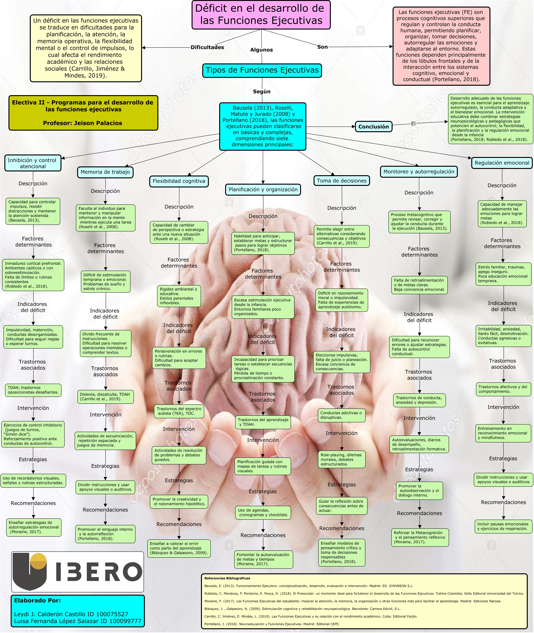 Este Cmap, tiene información relacionada con: Déficit en el desarrollo de las Funciones Ejecutivas, Falta de retroalimentación o de metas claras. Baja conciencia emocional. Indicadores del déficit Dificultad para reconocer errores o ajustar estrategias. Falta de autocontrol conductual., Dificultad para reconocer errores o ajustar estrategias. Falta de autocontrol conductual. Trastornos asociados Trastornos de conducta, ansiedad y depresión., Permite elegir entre alternativas considerando consecuencias y objetivos (Carrillo et al., 2019). Factores determinantes Déficit en razonamiento moral o impulsividad. Falta de experiencias de aprendizaje autónomo., TDAH, trastornos oposicionistas-desafiantes. Intervención Ejercicios de control inhibitorio (juegos de turnos, “Simón dice”). Reforzamiento positivo ante conductas de autocontrol., Bausela (2013), Roselli, Matute y Jurado (2008) y Portellano (2018), las funciones ejecutivas pueden clasificarse en básicas y complejas, comprendiendo siete dimensiones principales: Conclusión, Planificación guiada con mapas de tareas y rutinas visuales. Estrategias Uso de agendas, cronogramas y checklists., Capacidad de cambiar de perspectiva o estrategia ante una nueva situación (Roselli et al., 2008). Factores determinantes Rigidez ambiental o educativa. Estilos parentales inflexibles., Bausela (2013), Roselli, Matute y Jurado (2008) y Portellano (2018), las funciones ejecutivas pueden clasificarse en básicas y complejas, comprendiendo siete dimensiones principales: Regulación emocional, Uso de recordatorios visuales, señales y rutinas estructuradas. Recomendaciones Enseñar estrategias de autorregulación emocional (Moraine, 2017)., Tipos de Funciones Ejecutivas Según Bausela (2013), Roselli, Matute y Jurado (2008) y Portellano (2018), las funciones ejecutivas pueden clasificarse en básicas y complejas, comprendiendo siete dimensiones principales:, Trastornos del espectro autista (TEA), TOC. Intervención Actividades de resolución de problemas y debates guiados., Bausela (2013), Roselli, Matute y Jurado (2008) y Portellano (2018), las funciones ejecutivas pueden clasificarse en básicas y complejas, comprendiendo siete dimensiones principales: Inhibición y control atencional, Capacidad de manejar adecuadamente las emociones para lograr metas (Robledo et al., 2018). Factores determinantes Estrés familiar, traumas, apego inseguro. Poca educación emocional temprana., Trastornos de conducta, ansiedad y depresión. Intervención Autoevaluaciones, diarios de desempeño, retroalimentación formativa., Promover la creatividad y el razonamiento hipotético. Recomendaciones Enseñar a valorar el error como parte del aprendizaje (Blázquez & Galpasoro, 2009)., Monitoreo y autorregulación Descripción Proceso metacognitivo que permite revisar, corregir y ajustar la conducta durante la ejecución (Bausela, 2013)., Planificación y organización Descripción Habilidad para anticipar, establecer metas y estructurar pasos para lograr objetivos (Portellano, 2018)., Bausela (2013), Roselli, Matute y Jurado (2008) y Portellano (2018), las funciones ejecutivas pueden clasificarse en básicas y complejas, comprendiendo siete dimensiones principales: Toma de decisiones, Déficit en razonamiento moral o impulsividad. Falta de experiencias de aprendizaje autónomo. Indicadores del déficit Elecciones impulsivas, falta de juicio o planeación. Escasa conciencia de consecuencias., Impulsividad, inatención, conductas desorganizadas. Dificultad para seguir reglas o esperar turnos. Trastornos asociados TDAH, trastornos oposicionistas-desafiantes.