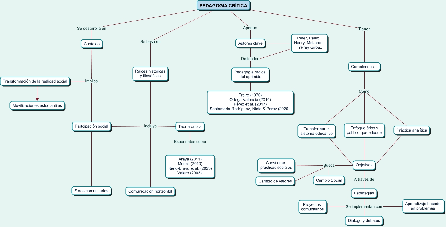 Este Cmap, tiene información relacionada con: Pedagogía crítica, Contexto Implica Partcipación social, Objetivos Busca Cambio Social, PEDAGOGÍA CRÍTICA Tienen Caracteristicas, Enfoque ético y político que eduque ???? Objetivos, Transformación de la realidad social ???? Movilizaciones estudiantiles, Partcipación social ???? Foros comunitarios, Autores clave ???? Peter, Paulo, Henry, McLaren, Freirey Giroux, PEDAGOGÍA CRÍTICA Se desarrolla en Contexto, Objetivos Busca Cambio de valores, Contexto Implica Transformación de la realidad social, Raices históricas y filosóficas Incluye Teoría crítica, Pedagogía radical del oprimido ???? Freire (1970) Ortega Valencia (2014) Pérez et al. (2017) Santamaria-Rodríguez, Nieto & Pérez (2020)., Raices históricas y filosóficas Incluye Partcipación social, Teoría crítica Exponentes como Araya (2011) Munck (2010) Nieto-Bravo et al. (2023) Valero (2003)., Estrategias Se implementan con Aprendizaje basado en problemas, Práctica analítica ???? Objetivos, Autores clave Defienden Pedagogía radical del oprimido, Caracteristicas Como Enfoque ético y político que eduque, PEDAGOGÍA CRÍTICA Se basa en Raices históricas y filosóficas, Objetivos A través de Estrategias