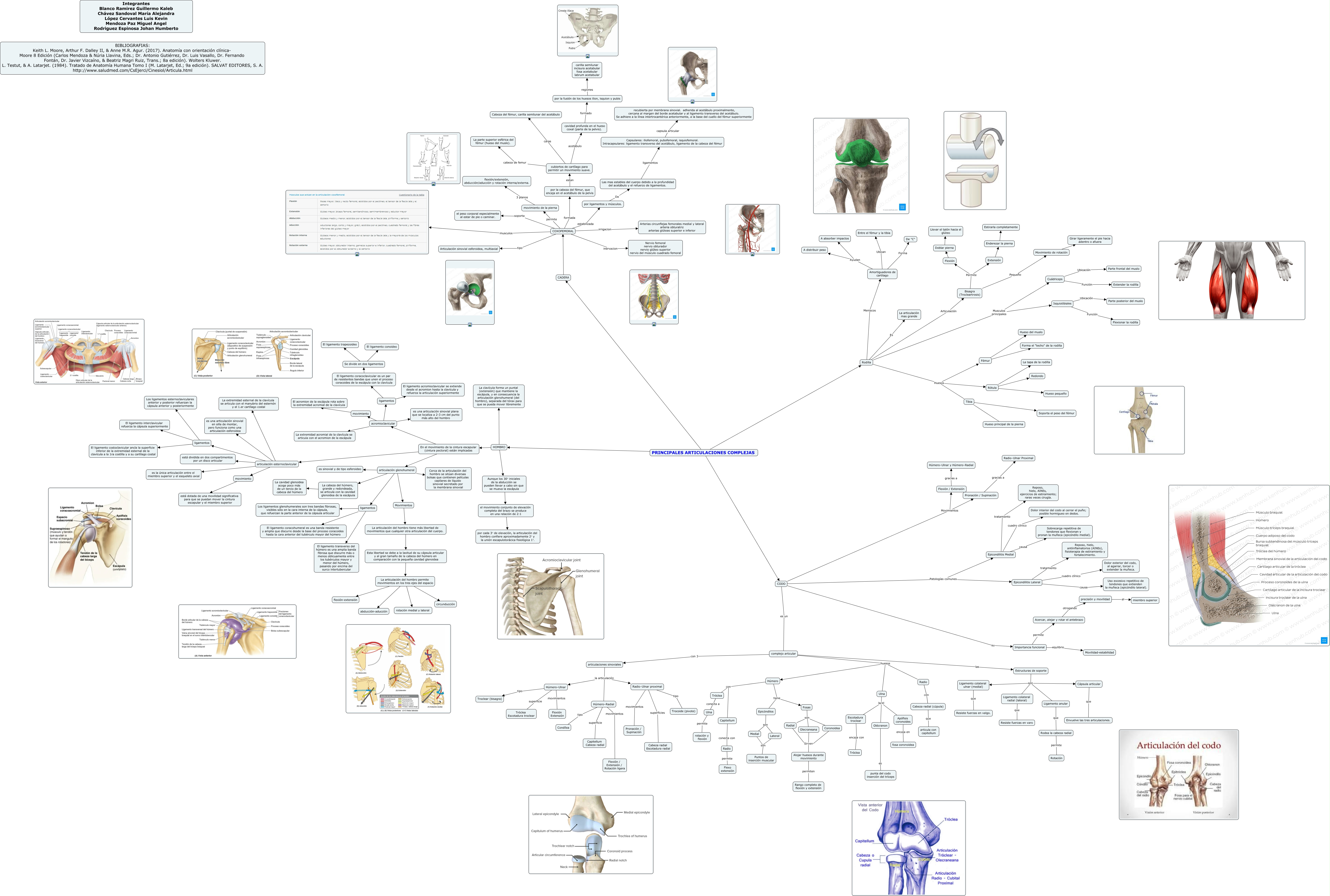 Este Cmap, tiene información relacionada con: Principales articulaciones complejas, Radio permite Flexo extensión, articulación esternoclavicular es la única articulación entre el miembro superior y el esqueleto axial, Fémur Hueso del muslo, La articulación del hombro permite movimientos en los tres ejes del espacio rotación medial y lateral, El ligamento coracoclavicular es un par de resistentes bandas que unen el proceso coracoides de la escápula con la clavícula Se divide en dos ligamentos, por la cabeza del fémur, que encaja en el acetábulo de la pelvis estan cubiertos de cartílago para permitir un movimiento suave., Movimientos La articulación del hombro tiene más libertad de movimientos que cualquier otra articulación del cuerpo., acromioclavicular movimiento, Radio–Ulnar proximal tipo Trocoide (pivote), articulación esternoclavicular La extremidad esternal de la clavícula se articula con el manubrio del esternón y el 1.er cartílago costal, Fémur Forma el "techo" de la rodilla, Se divide en dos ligamentos El ligamento trapezoideo, Rodilla Musculos principales Cuádriceps, Epicóndilos son Medial, cubiertos de cartílago para permitir un movimiento suave. caras Cabeza del fémur, carilla semilunar del acetábulo, articulación esternoclavicular movimiento, Amortiguadores de cartilago Ayudan A distribuir peso, Capsulares: iliofemoral, pubofemoral, isquiofemoral. Intracapsulares: ligamento transverso del acetábulo, ligamento de la cabeza del fémur capsula articular recubierta por membrana sinovial. adherida al acetábulo proximalmente, cercana al margen del borde acetabular y al ligamento transverso del acetábulo. Se adhiere a la línea intertrocantérica anteriormente, a la base del cuello del fémur superiormente, Rótula Redondo, Amortiguadores de cartilago Forma De "C"