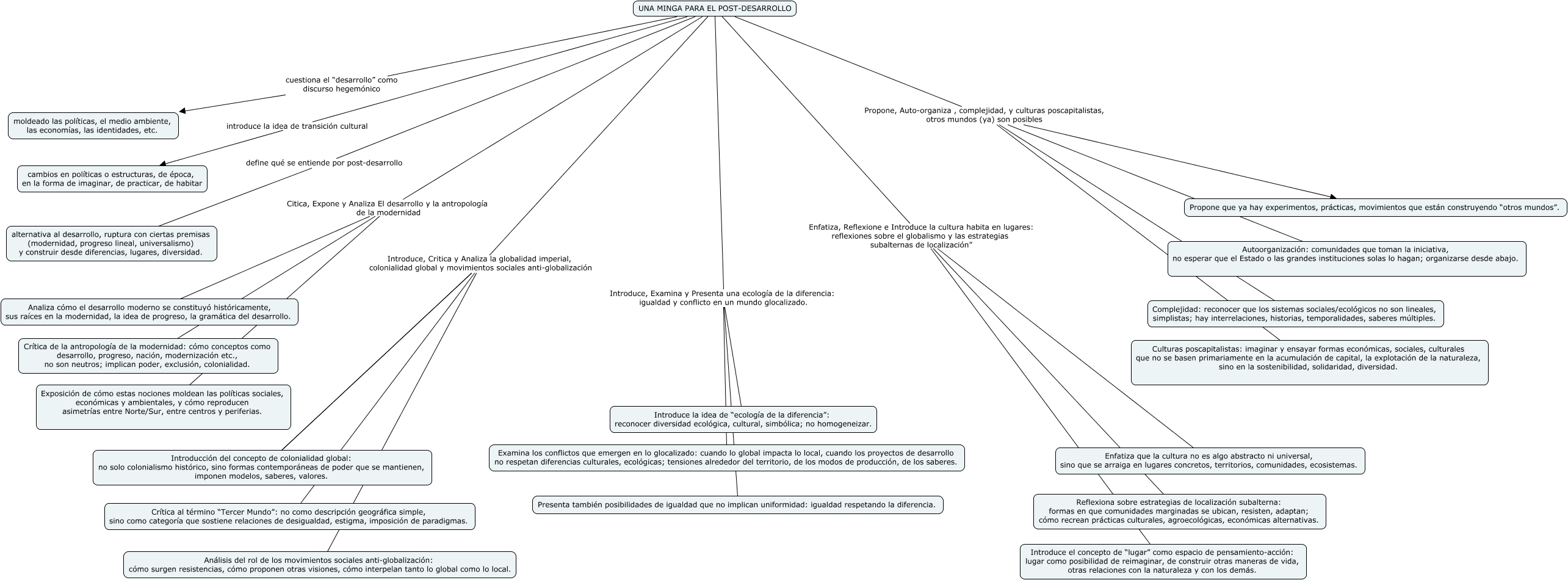 Este Cmap, tiene información relacionada con: Una minga para el postdesarrollo - MCZD, UNA MINGA PARA EL POST-DESARROLLO introduce la idea de transición cultural cambios en políticas o estructuras, de época, en la forma de imaginar, de practicar, de habitar, UNA MINGA PARA EL POST-DESARROLLO Introduce, Critica y Analiza la globalidad imperial, colonialidad global y movimientos sociales anti-globalización Análisis del rol de los movimientos sociales anti-globalización: cómo surgen resistencias, cómo proponen otras visiones, cómo interpelan tanto lo global como lo local., UNA MINGA PARA EL POST-DESARROLLO Enfatiza, Reflexione e Introduce la cultura habita en lugares: reflexiones sobre el globalismo y las estrategias subalternas de localización” Introduce el concepto de “lugar” como espacio de pensamiento-acción: lugar como posibilidad de reimaginar, de construir otras maneras de vida, otras relaciones con la naturaleza y con los demás., UNA MINGA PARA EL POST-DESARROLLO cuestiona el “desarrollo” como discurso hegemónico moldeado las políticas, el medio ambiente, las economías, las identidades, etc., UNA MINGA PARA EL POST-DESARROLLO Introduce, Critica y Analiza la globalidad imperial, colonialidad global y movimientos sociales anti-globalización Introducción del concepto de colonialidad global: no solo colonialismo histórico, sino formas contemporáneas de poder que se mantienen, imponen modelos, saberes, valores., UNA MINGA PARA EL POST-DESARROLLO Introduce, Examina y Presenta una ecología de la diferencia: igualdad y conflicto en un mundo glocalizado. Examina los conflictos que emergen en lo glocalizado: cuando lo global impacta lo local, cuando los proyectos de desarrollo no respetan diferencias culturales, ecológicas; tensiones alrededor del territorio, de los modos de producción, de los saberes., UNA MINGA PARA EL POST-DESARROLLO Propone, Auto-organiza , complejidad, y culturas poscapitalistas, otros mundos (ya) son posibles Propone que ya hay experimentos, prácticas, movimientos que están construyendo “otros mundos”., UNA MINGA PARA EL POST-DESARROLLO Citica, Expone y Analiza El desarrollo y la antropología de la modernidad Exposición de cómo estas nociones moldean las políticas sociales, económicas y ambientales, y cómo reproducen asimetrías entre Norte/Sur, entre centros y periferias., UNA MINGA PARA EL POST-DESARROLLO define qué se entiende por post-desarrollo alternativa al desarrollo, ruptura con ciertas premisas (modernidad, progreso lineal, universalismo) y construir desde diferencias, lugares, diversidad., UNA MINGA PARA EL POST-DESARROLLO Introduce, Critica y Analiza la globalidad imperial, colonialidad global y movimientos sociales anti-globalización Crítica al término “Tercer Mundo”: no como descripción geográfica simple, sino como categoría que sostiene relaciones de desigualdad, estigma, imposición de paradigmas., UNA MINGA PARA EL POST-DESARROLLO Enfatiza, Reflexione e Introduce la cultura habita en lugares: reflexiones sobre el globalismo y las estrategias subalternas de localización” Reflexiona sobre estrategias de localización subalterna: formas en que comunidades marginadas se ubican, resisten, adaptan; cómo recrean prácticas culturales, agroecológicas, económicas alternativas., UNA MINGA PARA EL POST-DESARROLLO Citica, Expone y Analiza El desarrollo y la antropología de la modernidad Analiza cómo el desarrollo moderno se constituyó históricamente, sus raíces en la modernidad, la idea de progreso, la gramática del desarrollo., UNA MINGA PARA EL POST-DESARROLLO Introduce, Examina y Presenta una ecología de la diferencia: igualdad y conflicto en un mundo glocalizado. Presenta también posibilidades de igualdad que no implican uniformidad: igualdad respetando la diferencia., UNA MINGA PARA EL POST-DESARROLLO Propone, Auto-organiza , complejidad, y culturas poscapitalistas, otros mundos (ya) son posibles Culturas poscapitalistas: imaginar y ensayar formas económicas, sociales, culturales que no se basen primariamente en la acumulación de capital, la explotación de la naturaleza, sino en la sostenibilidad, solidaridad, diversidad., UNA MINGA PARA EL POST-DESARROLLO Introduce, Critica y Analiza la globalidad imperial, colonialidad global y movimientos sociales anti-globalización Introducción del concepto de colonialidad global: no solo colonialismo histórico, sino formas contemporáneas de poder que se mantienen, imponen modelos, saberes, valores., UNA MINGA PARA EL POST-DESARROLLO Enfatiza, Reflexione e Introduce la cultura habita en lugares: reflexiones sobre el globalismo y las estrategias subalternas de localización” Enfatiza que la cultura no es algo abstracto ni universal, sino que se arraiga en lugares concretos, territorios, comunidades, ecosistemas., UNA MINGA PARA EL POST-DESARROLLO Propone, Auto-organiza , complejidad, y culturas poscapitalistas, otros mundos (ya) son posibles Complejidad: reconocer que los sistemas sociales/ecológicos no son lineales, simplistas; hay interrelaciones, historias, temporalidades, saberes múltiples., UNA MINGA PARA EL POST-DESARROLLO Citica, Expone y Analiza El desarrollo y la antropología de la modernidad Crítica de la antropología de la modernidad: cómo conceptos como desarrollo, progreso, nación, modernización etc., no son neutros; implican poder, exclusión, colonialidad., UNA MINGA PARA EL POST-DESARROLLO Propone, Auto-organiza , complejidad, y culturas poscapitalistas, otros mundos (ya) son posibles Autoorganización: comunidades que toman la iniciativa, no esperar que el Estado o las grandes instituciones solas lo hagan; organizarse desde abajo., UNA MINGA PARA EL POST-DESARROLLO Introduce, Examina y Presenta una ecología de la diferencia: igualdad y conflicto en un mundo glocalizado. Introduce la idea de “ecología de la diferencia”: reconocer diversidad ecológica, cultural, simbólica; no homogeneizar.