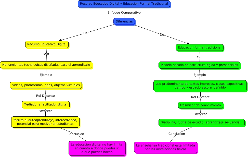 Este Cmap, tiene información relacionada con: MAPA CONCEPTUAL RECURSOS EDUCATIVO DIGITALES, Herramientas tecnologicas diseñadas para el aprendizaje Ejemplo videos, plataformas, apps, objetos virtuales, Diferencias De Recurso Educativo Digital, Mediador y facilitador digital Favorece facilita el autoaprendizaje, interactividad, potencial para motivar al estudiante., Modelo basado en estructura rigida y presenciales Ejemplo uso predominante de textos impresos, clases expositivas, tiempo y espacio escolar definido, Educacion formal tradicional son Modelo basado en estructura rigida y presenciales, Diferencias De Educacion formal tradicional, Disciplina, rutina de estudio, aprendizaje secuencial . Conclusion La enseñanza tradicional esta limitada por las instalaciones fisicas, uso predominante de textos impresos, clases expositivas, tiempo y espacio escolar definido Rol Docente trasmisor de conocimiento, Recurso Educativo Digital y Educacion Formal Tradicional Enfoque Comparativo Diferencias, trasmisor de conocimiento Favorece Disciplina, rutina de estudio, aprendizaje secuencial ., videos, plataformas, apps, objetos virtuales Rol Docente Mediador y facilitador digital, facilita el autoaprendizaje, interactividad, potencial para motivar al estudiante. Conclusion La educacion digital no hay limite en cuanto a donde puedes ir o que puedes hacer., Recurso Educativo Digital son Herramientas tecnologicas diseñadas para el aprendizaje