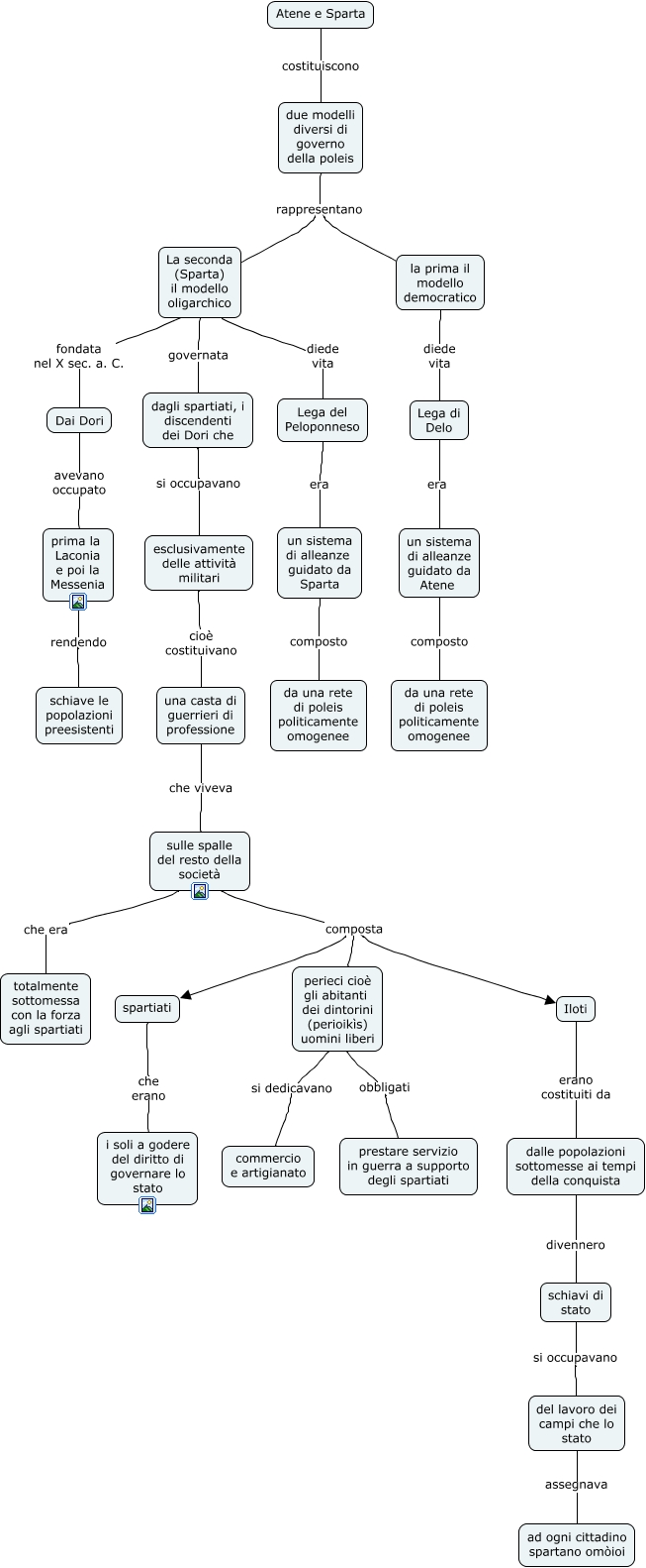 Questa Cmap, creata con IHMC CmapTools, contiene informazioni relative a: Atene e Sparta due modelli alternativi di polis greca, dalle popolazioni sottomesse ai tempi della conquista divennero schiavi di stato, Lega di Delo era un sistema di alleanze guidato da Atene, perieci cioè gli abitanti dei dintorini (perioikìs) uomini liberi si dedicavano commercio e artigianato, due modelli diversi di governo della poleis rappresentano La seconda (Sparta) il modello oligarchico, un sistema di alleanze guidato da Sparta composto da una rete di poleis politicamente omogenee, Dai Dori avevano occupato prima la Laconia e poi la Messenia, Lega del Peloponneso era un sistema di alleanze guidato da Sparta, del lavoro dei campi che lo stato assegnava ad ogni cittadino spartano omòioi, una casta di guerrieri di professione che viveva sulle spalle del resto della società, spartiati che erano i soli a godere del diritto di governare lo stato, schiavi di stato si occupavano del lavoro dei campi che lo stato, sulle spalle del resto della società composta perieci cioè gli abitanti dei dintorini (perioikìs) uomini liberi, sulle spalle del resto della società composta spartiati, perieci cioè gli abitanti dei dintorini (perioikìs) uomini liberi obbligati prestare servizio in guerra a supporto degli spartiati, la prima il modello democratico diede vita Lega di Delo, La seconda (Sparta) il modello oligarchico fondata nel X sec. a. C. Dai Dori, esclusivamente delle attività militari cioè costituivano una casta di guerrieri di professione, sulle spalle del resto della società composta Iloti, Iloti erano costituiti da dalle popolazioni sottomesse ai tempi della conquista, sulle spalle del resto della società che era totalmente sottomessa con la forza agli spartiati