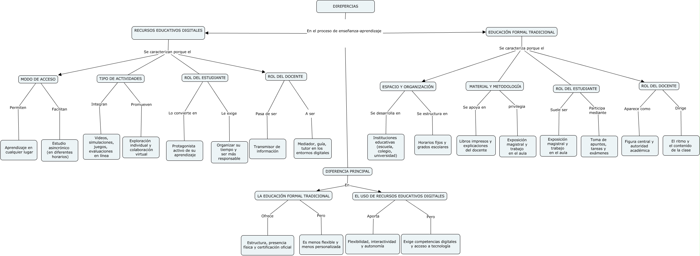 Este Cmap, tiene información relacionada con: DIFERENCIAS ENTRE LA EDUCACION TRADICIONAL Y RECURSOS EDUCATIVOS DIGITALES, RECURSOS EDUCATIVOS DIGITALES Se caracterizan porque el TIPO DE ACTIVIDADES, ROL DEL DOCENTE Pasa de ser Transmisor de información, EL USO DE RECURSOS EDUCATIVOS DIGITALES Pero Exige competencias digitales y acceso a tecnología, TIPO DE ACTIVIDADES Integran Videos, simulaciones, juegos, evaluaciones en línea, MODO DE ACCESO Facilitan Estudio asincrónico (en diferentes horarios), ROL DEL ESTUDIANTE Le exige Organizar su tiempo y ser más responsable, RECURSOS EDUCATIVOS DIGITALES Se caracterizan porque el ROL DEL DOCENTE, ROL DEL DOCENTE Aparece como Figura central y autoridad académica, ROL DEL ESTUDIANTE Suele ser Exposición magistral y trabajo en el aula, DIFERENCIA PRINCIPAL En EL USO DE RECURSOS EDUCATIVOS DIGITALES, EDUCACIÓN FORMAL TRADICIONAL Se caracteriza porque el MATERIAL Y METODOLOGÍA, ESPACIO Y ORGANIZACIÓN Se estructura en Horarios fijos y grados escolares, EDUCACIÓN FORMAL TRADICIONAL Se caracteriza porque el ROL DEL DOCENTE, ROL DEL DOCENTE A ser Mediador, guía, tutor en los entornos digitales, ROL DEL ESTUDIANTE Participa mediante Toma de apuntes, tareas y exámenes, LA EDUCACIÓN FORMAL TRADICIONAL Ofrece Estructura, presencia física y certificación oficial, EDUCACIÓN FORMAL TRADICIONAL Se caracteriza porque el ESPACIO Y ORGANIZACIÓN, DIREFERCIAS En el proceso de enseñanza-aprendizaje EDUCACIÓN FORMAL TRADICIONAL, MODO DE ACCESO Permiten Aprendizaje en cualquier lugar, RECURSOS EDUCATIVOS DIGITALES Se caracterizan porque el MODO DE ACCESO