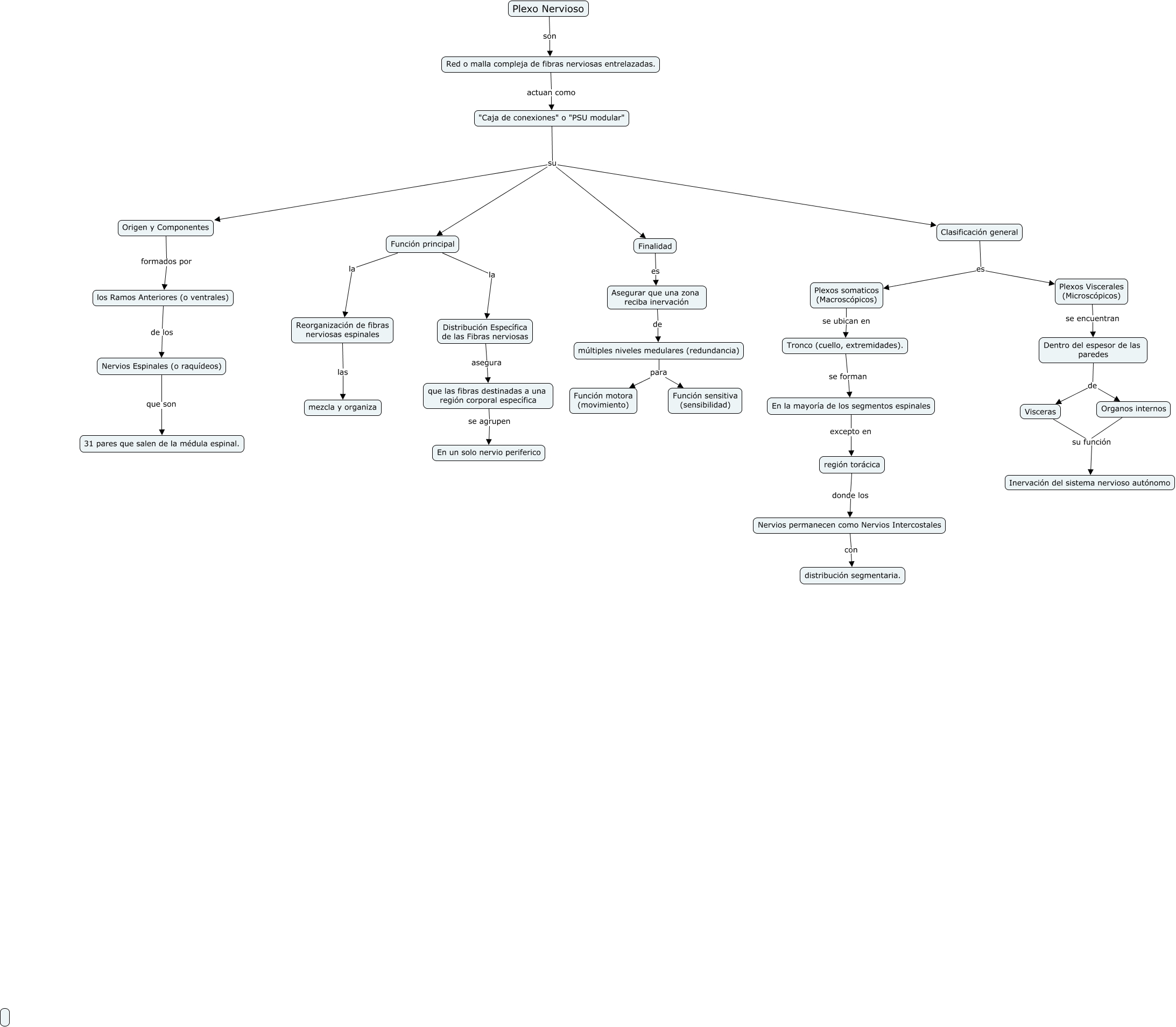 Este Cmap, tiene información relacionada con: Generalidades plexos nerviosos, que las fibras destinadas a una región corporal específica se agrupen En un solo nervio periferico, Organos internos su función Inervación del sistema nervioso autónomo, Plexos somaticos (Macroscópicos) se ubican en Tronco (cuello, extremidades)., "Caja de conexiones" o "PSU modular" su Origen y Componentes, Reorganización de fibras nerviosas espinales las mezcla y organiza, Dentro del espesor de las paredes de Organos internos, Plexo Nervioso son Red o malla compleja de fibras nerviosas entrelazadas., "Caja de conexiones" o "PSU modular" su Finalidad, Nervios permanecen como Nervios Intercostales con distribución segmentaria., Función principal la Reorganización de fibras nerviosas espinales, los Ramos Anteriores (o ventrales) de los Nervios Espinales (o raquídeos), Nervios Espinales (o raquídeos) que son 31 pares que salen de la médula espinal., "Caja de conexiones" o "PSU modular" su Función principal, Función principal la Distribución Específica de las Fibras nerviosas, múltiples niveles medulares (redundancia) para Función motora (movimiento), Clasificación general es Plexos somaticos (Macroscópicos), Dentro del espesor de las paredes de Visceras, múltiples niveles medulares (redundancia) para Función sensitiva (sensibilidad), "Caja de conexiones" o "PSU modular" su Clasificación general, Asegurar que una zona reciba inervación de múltiples niveles medulares (redundancia)