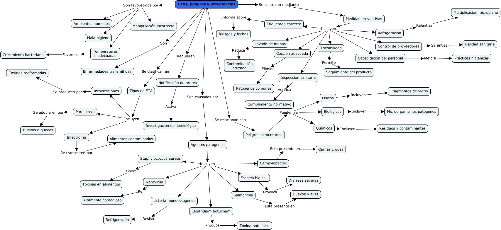 Este Cmap, tiene información relacionada con: MAPA CONCEPTUAL SOBRE LAS ETA´S O LAS TOXIINFECCIONES ALIMENTARIAS, PELIGROS Y PREVALENCIAS EN LA INDUSTRIA ALIMENTARIA, Peligros alimentarios Pueden ser Físicos, Medidas preventivas Incluyen Capacitación del personal, Medidas preventivas Incluyen Inspección sanitaria, ETAs, peligros y prevalencias Se relacionan con Peligros alimentarios, ETAs, peligros y prevalencias Se clasifican en Tipos de ETA, Medidas preventivas Incluyen Lavado de manos, ETAs, peligros y prevalencias Son causadas por Agentes patógenos, Medidas preventivas Incluyen Etiquetado correcto, Agentes patógenos Incluyen Salmonella, Clostridium botulinum Produce Toxina botulínica, Peligros alimentarios Pueden ser Biológicos, Listeria monocytogenes Resiste Refrigeración, Agentes patógenos Incluyen Campylobacter, Peligros alimentarios Pueden ser Químicos, Infecciones Se transmiten por Alimentos contaminados, Tipos de ETA Incluyen Parasitosis, Químicos Incluyen Residuos y contaminantes, Agentes patógenos Incluyen Norovirus, Campylobacter Está presente en Carnes crudas, Medidas preventivas Incluyen Trazabilidad