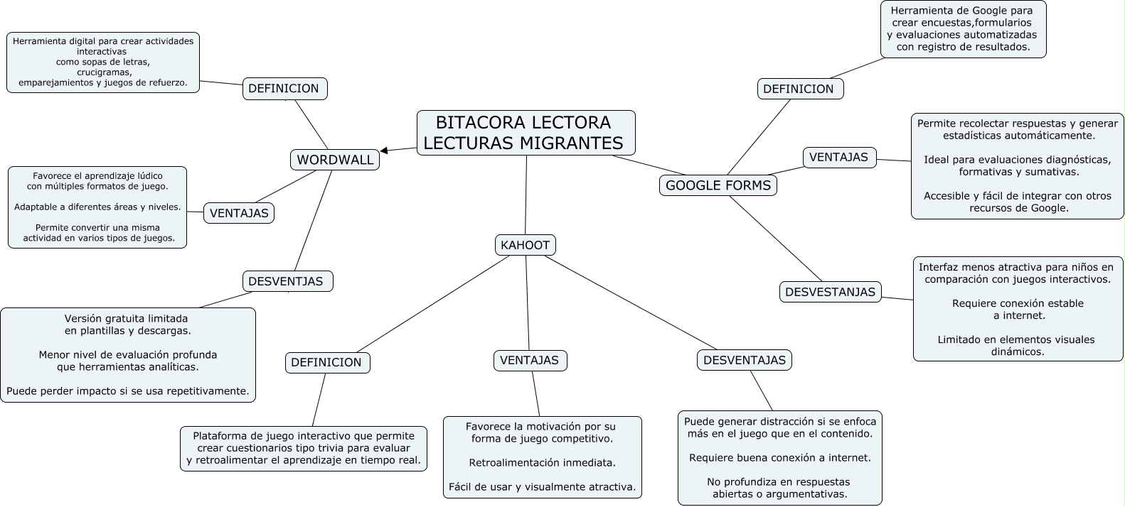 Este Cmap, tiene información relacionada con: Diseño de un RED bajo un modelo de diseño instruccional, WORDWALL ???? DESVENTJAS, GOOGLE FORMS ???? DEFINICION, WORDWALL ???? DEFINICION, VENTAJAS ???? Favorece la motivación por su forma de juego competitivo. Retroalimentación inmediata. Fácil de usar y visualmente atractiva., VENTAJAS ???? Favorece la motivación por su forma de juego competitivo. Retroalimentación inmediata. Fácil de usar y visualmente atractiva., BITACORA LECTORA LECTURAS MIGRANTES ???? WORDWALL, WORDWALL ???? VENTAJAS, KAHOOT ???? VENTAJAS, KAHOOT ???? DESVENTAJAS, DEFINICION ???? Herramienta digital para crear actividades interactivas como sopas de letras, crucigramas, emparejamientos y juegos de refuerzo., DEFINICION ???? Herramienta de Google para crear encuestas,formularios y evaluaciones automatizadas con registro de resultados., WORDWALL ???? DEFINICION, DESVENTAJAS ???? Puede generar distracción si se enfoca más en el juego que en el contenido. Requiere buena conexión a internet. No profundiza en respuestas abiertas o argumentativas., DEFINICION ???? Plataforma de juego interactivo que permite crear cuestionarios tipo trivia para evaluar y retroalimentar el aprendizaje en tiempo real., GOOGLE FORMS ???? DESVESTANJAS, VENTAJAS ???? Permite recolectar respuestas y generar estadísticas automáticamente. Ideal para evaluaciones diagnósticas, formativas y sumativas. Accesible y fácil de integrar con otros recursos de Google., DESVENTJAS ???? Versión gratuita limitada en plantillas y descargas. Menor nivel de evaluación profunda que herramientas analíticas. Puede perder impacto si se usa repetitivamente., BITACORA LECTORA LECTURAS MIGRANTES ???? GOOGLE FORMS, KAHOOT ???? DEFINICION, BITACORA LECTORA LECTURAS MIGRANTES ???? KAHOOT