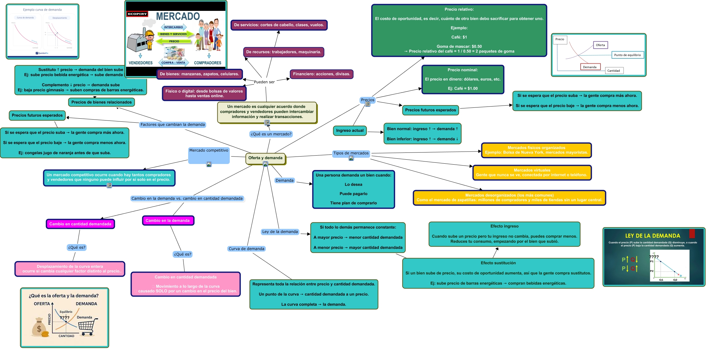 Este Cmap, tiene información relacionada con: Mapa Conceptual, Si todo lo demás permanece constante: A mayor precio → menor cantidad demandada A menor precio → mayor cantidad demandada ???? Efecto sustitución Si un bien sube de precio, su costo de oportunidad aumenta, así que la gente compra sustitutos. Ej: sube precio de barras energéticas → compran bebidas energéticas., Oferta y demanda Factores que cambian la demanda Precios de bienes relacionados, Un mercado es cualquier acuerdo donde compradores y vendedores pueden intercambiar información y realizar transacciones. Pueden ser De recursos: trabajadores, maquinaria., Oferta y demanda Factores que cambian la demanda Precios futuros esperados, Un mercado es cualquier acuerdo donde compradores y vendedores pueden intercambiar información y realizar transacciones. Pueden ser De bienes: manzanas, zapatos, celulares., Oferta y demanda Cambio en la demanda vs. cambio en cantidad demandada Cambio en cantidad demandada, Ingreso actual ???? Bien normal: ingreso ↑ → demanda ↑ Bien inferior: ingreso ↑ → demanda ↓, Oferta y demanda Precios Ingreso actual, Oferta y demanda Mercado competitivo Un mercado competitivo ocurre cuando hay tantos compradores y vendedores que ninguno puede influir por sí solo en el precio., Cambio en la demanda ¿Qué es? Cambio en cantidad demandada ➡ Movimiento a lo largo de la curva ➡ causado SOLO por un cambio en el precio del bien., Precios de bienes relacionados ???? Sustituto ↑ precio → demanda del bien sube Ej: sube precio bebida energética → sube demanda barras. Complemento ↓ precio → demanda sube Ej: baja precio gimnasio → suben compras de barras energéticas., Oferta y demanda Precios Precio nominal: El precio en dinero: dólares, euros, etc. Ej: Café = $1.00, Oferta y demanda Demanda Una persona demanda un bien cuando: Lo desea Puede pagarlo Tiene plan de comprarlo, Un mercado es cualquier acuerdo donde compradores y vendedores pueden intercambiar información y realizar transacciones. Pueden ser Físico o digital: desde bolsas de valores hasta ventas online., Oferta y demanda ¿Qué es un mercado? Un mercado es cualquier acuerdo donde compradores y vendedores pueden intercambiar información y realizar transacciones., Oferta y demanda Tipos de mercados Mercados virtuales Gente que nunca se ve, conectada por internet o teléfono., Un mercado es cualquier acuerdo donde compradores y vendedores pueden intercambiar información y realizar transacciones. Pueden ser Financiero: acciones, divisas., Oferta y demanda Cambio en la demanda vs. cambio en cantidad demandada Cambio en la demanda, Precios futuros esperados ???? Si se espera que el precio suba → la gente compra más ahora. Si se espera que el precio baje → la gente compra menos ahora., Cambio en cantidad demandada ¿Qué es? Desplazamiento de la curva entera ➡ ocurre si cambia cualquier factor distinto al precio..