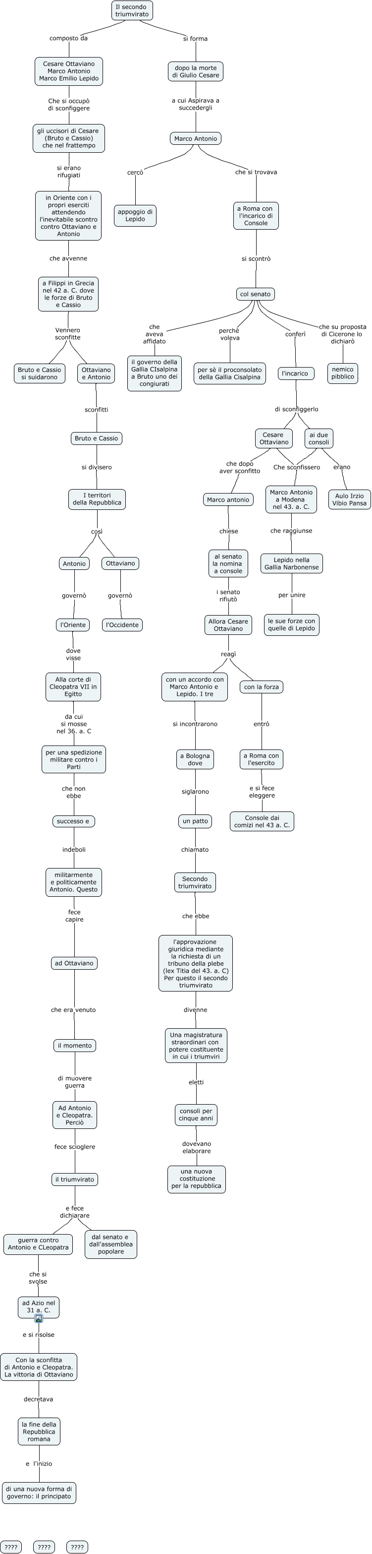 Questa Cmap, creata con IHMC CmapTools, contiene informazioni relative a: Il seconsdo triumvirato, Con la sconfitta di Antonio e Cleopatra. La vittoria di Ottaviano decretava la fine della Repubblica romana, Ad Antonio e Cleopatra. Perciò fece scioglere il triumvirato, l'incarico di sconfiggerlo Cesare Ottaviano, Antonio governò l'Oriente, Lepido nella Gallia Narbonense per unire le sue forze con quelle di Lepido, Il secondo triumvirato composto da Cesare Ottaviano Marco Antonio Marco Emilio Lepido, ai due consoli Che sconfissero Marco Antonio a Modena nel 43. a. C., Ottaviano governò l'Occidente, col senato che aveva affidato il governo della Gallia CIsalpina a Bruto uno dei congiurati, il triumvirato e fece dichiarare guerra contro Antonio e CLeopatra, ad Ottaviano che era venuto il momento, I territori della Repubblica così Antonio, la fine della Repubblica romana e l'inizio di una nuova forma di governo: il principato, Marco Antonio cercò appoggio di Lepido, Allora Cesare Ottaviano reagì con la forza, a Filippi in Grecia nel 42 a. C. dove le forze di Bruto e Cassio Vennero sconfitte Bruto e Cassio si suidarono, Cesare Ottaviano Marco Antonio Marco Emilio Lepido Che si occupò di sconfiggere gli uccisori di Cesare (Bruto e Cassio) che nel frattempo, Secondo triumvirato che ebbe l'approvazione giuridica mediante la richiesta di un tribuno della plebe (lex Titia del 43. a. C) Per questo il secondo triumvirato, al senato la nomina a console i senato rifiutò Allora Cesare Ottaviano, a Roma con l'incarico di Console si scontrò col senato