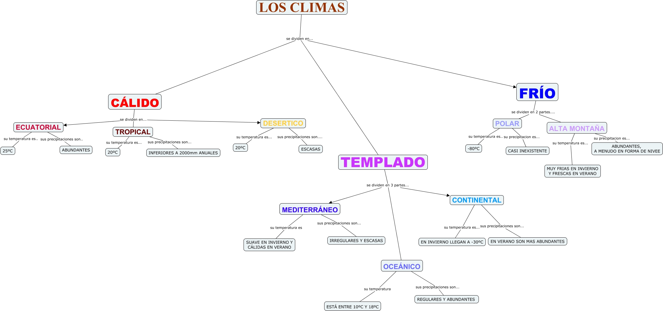 Este Cmap, tiene información relacionada con: los climas de la tierra por matei y eloy de 6º, FRÍO se dividen en 2 partes.... POLAR, ALTA MONTAÑA su temperatura es... MUY FRIAS EN INVIERNO Y FRESCAS EN VERANO, LOS CLIMAS se dividen en... TEMPLADO, ECUATORIAL sus precipitaciones son.. ABUNDANTES, MEDITERRÁNEO su temperatura es SUAVE EN INVIERNO Y CÁLIDAS EN VERANO, LOS CLIMAS se dividen en... FRÍO, FRÍO se dividen en 2 partes.... ALTA MONTAÑA, CONTINENTAL su temperatura es... EN INVIERNO LLEGAN A -30ºC, ECUATORIAL su temperatura es.. 25ºC, CÁLIDO se dividen en... ECUATORIAL, TEMPLADO se dividen en 3 partes... OCEÁNICO, TROPICAL sus precipitaciones son... INFERIORES A 2000mm ANUALES, MEDITERRÁNEO sus precipitaciones son... IRREGULARES Y ESCASAS, ALTA MONTAÑA su precipitacion es... ABUNDANTES, A MENUDO EN FORMA DE NIVEE, CÁLIDO se dividen en... DESERTICO, CÁLIDO se dividen en... TROPICAL, POLAR su precipitacion es... CASI INEXISTENTE, TEMPLADO se dividen en 3 partes... CONTINENTAL, OCEÁNICO su temperatura ESTÁ ENTRE 10ºC Y 18ºC, POLAR su temperatura es.. -80ºC