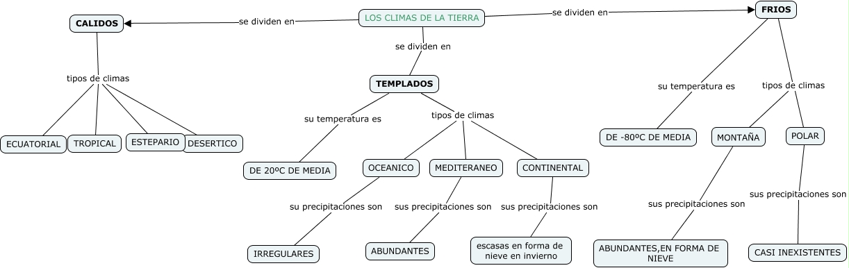 Este Cmap, tiene información relacionada con: climas de latierra, CALIDOS tipos de climas ECUATORIAL, FRIOS tipos de climas MONTAÑA, MEDITERANEO sus precipitaciones son ABUNDANTES, LOS CLIMAS DE LA TIERRA se dividen en TEMPLADOS, CALIDOS tipos de climas TROPICAL, LOS CLIMAS DE LA TIERRA se dividen en FRIOS, CONTINENTAL sus precipitaciones son escasas en forma de nieve en invierno, FRIOS tipos de climas POLAR, OCEANICO su precipitaciones son IRREGULARES, TEMPLADOS tipos de climas OCEANICO, CALIDOS tipos de climas ESTEPARIO, FRIOS su temperatura es DE -80ºC DE MEDIA, LOS CLIMAS DE LA TIERRA se dividen en CALIDOS, MONTAÑA sus precipitaciones son ABUNDANTES,EN FORMA DE NIEVE, TEMPLADOS tipos de climas MEDITERANEO, POLAR sus precipitaciones son CASI INEXISTENTES, TEMPLADOS tipos de climas CONTINENTAL, TEMPLADOS su temperatura es DE 20ºC DE MEDIA, CALIDOS tipos de climas DESERTICO