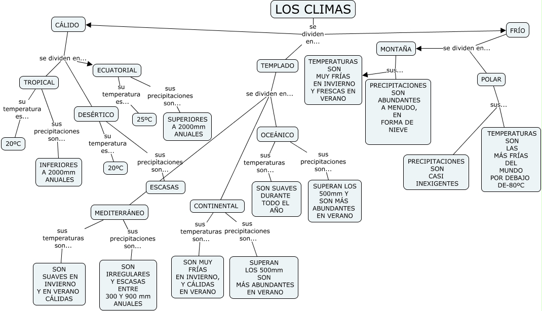 Este Cmap, tiene información relacionada con: EL CLIMA DE J Y A, OCEÁNICO sus precipitaciones son... SUPERAN LOS 500mm Y SON MÁS ABUNDANTES EN VERANO, TROPICAL sus precipitaciones son... INFERIORES A 2000mm ANUALES, DESÉRTICO sus precipìtaciones son... ESCASAS, TROPICAL su temperatura es... 20ºC, CONTINENTAL sus temperaturas son... SON MUY FRÍAS EN INVIERNO, Y CÁLIDAS EN VERANO, ECUATORIAL sus precipitaciones son... SUPERIORES A 2000mm ANUALES, TEMPLADO se dividen en... MEDITERRÁNEO, POLAR sus... PRECIPITACIONES SON CASI INEXIGENTES, MONTAÑA sus... PRECIPITACIONES SON ABUNDANTES A MENUDO, EN FORMA DE NIEVE, LOS CLIMAS se dividen en... FRÍO, CÁLIDO se dividen en... ECUATORIAL, DESÉRTICO su temperatura es... 20ºC, FRÍO se dividen en... MONTAÑA, FRÍO se dividen en... POLAR, MONTAÑA sus... TEMPERATURAS SON MUY FRÍAS EN INVIERNO Y FRESCAS EN VERANO, TEMPLADO se dividen en... OCEÁNICO, MEDITERRÁNEO sus precipitaciones son... SON IRREGULARES Y ESCASAS ENTRE 300 Y 900 mm ANUALES, MEDITERRÁNEO sus temperaturas son... SON SUAVES EN INVIERNO Y EN VERANO CÁLIDAS, CÁLIDO se dividen en... TROPICAL, LOS CLIMAS se dividen en... TEMPLADO