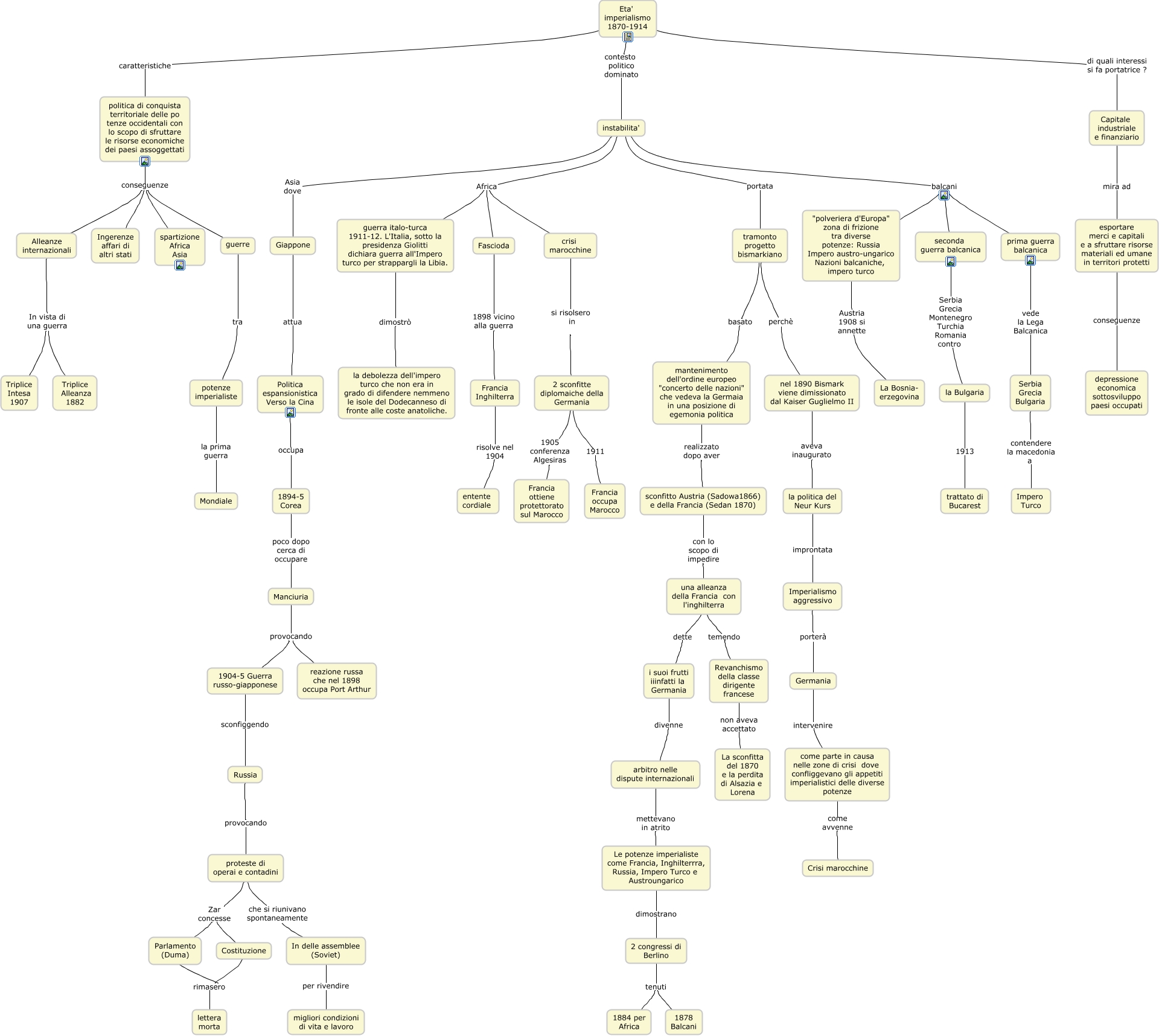 Questa Cmap, creata con IHMC CmapTools, contiene informazioni relative a: the age of imperialism per VD, la Bulgaria 1913 trattato di Bucarest, Alleanze internazionali In vista di una guerra Triplice Alleanza 1882, Parlamento (Duma) rimasero lettera morta, Eta' imperialismo 1870-1914 di quali interessi si fa portatrice ? Capitale industriale e finanziario, prima guerra balcanica vede la Lega Balcanica Serbia Grecia Bulgaria, 2 sconfitte diplomaiche della Germania 1905 conferenza Algesiras Francia ottiene protettorato sul Marocco, seconda guerra balcanica Serbia Grecia Montenegro Turchia Romania contro la Bulgaria, potenze imperialiste la prima guerra Mondiale, nel 1890 Bismark viene dimissionato dal Kaiser Guglielmo II aveva inaugurato la politica del Neur Kurs, Politica espansionistica Verso la Cina occupa 1894-5 Corea, 2 sconfitte diplomaiche della Germania 1911 Francia occupa Marocco, Giappone attua Politica espansionistica Verso la Cina, instabilita' Africa Fascioda, Le potenze imperialiste come Francia, Inghilterrra, Russia, Impero Turco e Austroungarico dimostrano 2 congressi di Berlino, esportare merci e capitali e a sfruttare risorse materiali ed umane in territori protetti conseguenze depressione economica sottosviluppo paesi occupati, politica di conquista territoriale delle po tenze occidentali con lo scopo di sfruttare le risorse economiche dei paesi assoggettati conseguenze guerre, tramonto progetto bismarkiano basato mantenimento dell'ordine europeo "concerto delle nazioni" che vedeva la Germaia in una posizione di egemonia politica, Imperialismo aggressivo porterà Germania, 2 congressi di Berlino tenuti 1878 Balcani, Alleanze internazionali In vista di una guerra Triplice Intesa 1907