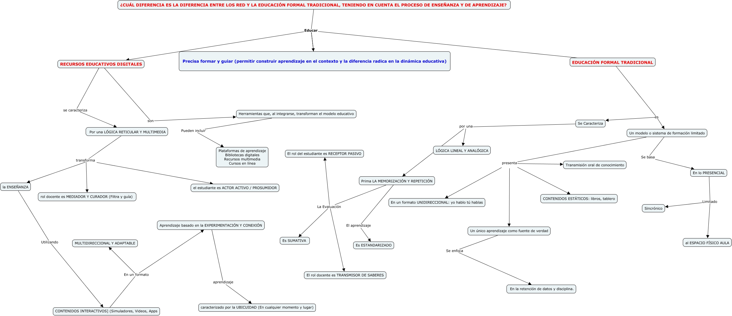 Este Cmap, tiene información relacionada con: RED Y EDUCACION TRADICIONAL, ¿CUÁL DIFERENCIA ES LA DIFERENCIA ENTRE LOS RED Y LA EDUCACIÓN FORMAL TRADICIONAL, TENIENDO EN CUENTA EL PROCESO DE ENSEÑANZA Y DE APRENDIZAJE? Educar Precisa formar y guiar (permitir construir aprendizaje en el contexto y la diferencia radica en la dinámica educativa), Se Caracteriza por una LÓGICA LINEAL Y ANALÓGICA, Por una LÓGICA RETICULAR Y MULTIMEDIA transforma la ENSEÑANZA, Un modelo o sistema de formación limitado Se basa En lo PRESENCIAL, Aprendizaje basado en la EXPERIMENTACIÓN Y CONEXIÓN aprendizaje caracterizado por la UBICUIDAD (En cualquier momento y lugar), Un modelo o sistema de formación limitado presenta Un único aprendizaje como fuente de verdad, Prima LA MEMORIZACIÓN Y REPETICIÓN El aprendizaje Es ESTANDARIZADO, RECURSOS EDUCATIVOS DIGITALES son Herramientas que, al integrarse, transforman el modelo educativo, ¿CUÁL DIFERENCIA ES LA DIFERENCIA ENTRE LOS RED Y LA EDUCACIÓN FORMAL TRADICIONAL, TENIENDO EN CUENTA EL PROCESO DE ENSEÑANZA Y DE APRENDIZAJE? Educar ????, Un único aprendizaje como fuente de verdad Se enfoca En la retención de datos y disciplina., CONTENIDOS INTERACTIVOS] (Simuladores, Videos, Apps En un formato MULTIDIRECCIONAL Y ADAPTABLE, CONTENIDOS INTERACTIVOS] (Simuladores, Videos, Apps En un formato Aprendizaje basado en la EXPERIMENTACIÓN Y CONEXIÓN, EDUCACIÓN FORMAL TRADICIONAL es Se Caracteriza, EDUCACIÓN FORMAL TRADICIONAL es Un modelo o sistema de formación limitado, Prima LA MEMORIZACIÓN Y REPETICIÓN La Evaluación El rol del estudiante es RECEPTOR PASIVO, Precisa formar y guiar (permitir construir aprendizaje en el contexto y la diferencia radica en la dinámica educativa) Educar ????, Un modelo o sistema de formación limitado presenta Transmisión oral de conocimiento, Un modelo o sistema de formación limitado presenta En un formato UNIDIRECCIONAL: yo hablo tú hablas, En lo PRESENCIAL Limitado al ESPACIO FÍSICO AULA, Por una LÓGICA RETICULAR Y MULTIMEDIA transforma el estudiante es ACTOR ACTIVO / PROSUMIDOR