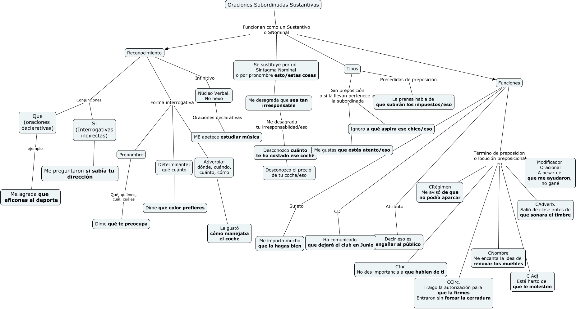 Este Cmap, tiene información relacionada con: Subordinadas Sustantivas, Desconozco cuánto te ha costado ese coche S Desconozco el precio de tu coche/eso, Funciones Término de preposición o locución preposicional en Modificador Oracional A pesar de que me ayudaron, no gané, Tipos Sin preposición o si la llevan pertenece a la subordinada Me gustas que estés atento/eso, Me desagrada que sea tan irresponsable Me desagrada tu irresponsablidad/eso Desconozco cuánto te ha costado ese coche, Funciones Término de preposición o locución preposicional en C Adj Está harto de que le molesten, Funciones Atributo Decir eso es engañar al público, Funciones Término de preposición o locución preposicional en CNombre Me encanta la idea de renovar los muebles, Funciones Sujeto Me importa mucho que lo hagas bien, Determinante: qué cuánto Dimé Dime qué color prefieres, Reconocimiento Infinitivo Núcleo Verbal. No nexo, Oraciones Subordinadas Sustantivas Funcionan como un Sustantivo o SNominal Reconocimiento, Oraciones Subordinadas Sustantivas Funcionan como un Sustantivo o SNominal Funciones, Pronombre Qué, quiénes, cuál, cuáles Dime qué te preocupa, Se sustituye por un Sintagma Nominal o por pronombre esto/estas cosas ???? Me desagrada que sea tan irresponsable, Que (oraciones declarativas) ejemplo Me agrada que aficones al deporte, Funciones Término de preposición o locución preposicional en CAdverb. Salió de clase antes de que sonara el timbre, Tipos Precedidas de preposición La prensa habla de que subirán los impuestos/eso, Reconocimiento Conjunciones Si (Interrogativas indirectas), Reconocimiento Forma interrogativa Adverbio: dónde, cuándo, cuánto, cómo, Funciones Término de preposición o locución preposicional en CCirc. Traigo la autorización para que la firmes Entraron sin forzar la cerradura