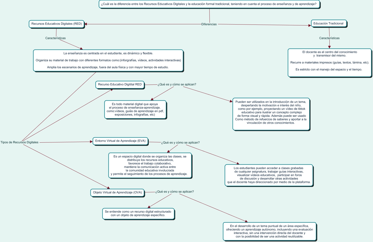 Este Cmap, tiene información relacionada con: Recursos Educativos y Educación Tradicional, La enseñanza es centrada en el estudiante, es dinámico y flexible. Organiza su material de trabajo con diferentes formatos como:(inforgrafías, vídeos, actividades interactivas) Amplia los escenarios de aprendizaje, fuera del aula física y con mayor tiempo de estudio. Tipos de Recursos Digitales Objeto Virtual de Aprendizaje (OVA), Objeto Virtual de Aprendizaje (OVA) ¿Qué es y cómo se aplican? En el desarrollo de un tema puntual de un área específica, ofreciendo un aprendizaje autónomo, incluyendo una evaluación interactiva, sin una intervención directa del docente y con la posibilidad de ser una actividad reutilizable., Recurso Educativo Digitital RED ¿Qué es y cómo se aplican? Pueden ser utilizados en la introducción de un tema, despertando la motivación e interés del niño, como por ejemplo, proyectando un vídeo de tiktok educativo para ilustrar un concepto complejo de forma visual y rápida. Además puede ser usado Como método de refuerzos de saberes y aportar a la vinculación de otros conocimientos., Entorno Virtual de Aprendizaje (EVA) ¿Qué es y cómo se aplican? Es un espacio digital donde se organiza las clases, se distribuye los recursos educativos, favorece el trabajo colaborativo, mantiene la comunicación activa entre la comunidad educativa involucrada y permite el seguimiento de los procesos de aprendizaje., Objeto Virtual de Aprendizaje (OVA) ¿Qué es y cómo se aplican? Se entiende como un recurso digital estructurado con un objeto de aprendizaje específico., Recurso Educativo Digitital RED ¿Qué es y cómo se aplican? Es todo material digital que apoya el proceso de enseñanza-aprendizaje. como:vídeos, guiás de aprendizaje en pdf, exposiciones, infografías, etc), ¿Cuál es la diferencia entre los Recursos Educativos Digitales y la educación formal tradicional, teniendo en cuenta el proceso de enseñanza y de aprendizaje? Diferencias Recursos Educativos Digitales (RED), La enseñanza es centrada en el estudiante, es dinámico y flexible. Organiza su material de trabajo con diferentes formatos como:(inforgrafías, vídeos, actividades interactivas) Amplia los escenarios de aprendizaje, fuera del aula física y con mayor tiempo de estudio. Tipos de Recursos Digitales Recurso Educativo Digitital RED, Entorno Virtual de Aprendizaje (EVA) ¿Qué es y cómo se aplican? Los estudiantes pueden acceder a clases grabadas de cualquier asignatura, trabajar guías interactivas, visualizar vídeos educativos, participar en foros de discusión y desarrollar otras actividades que el docente haya direccionado por medio de la plataforma., Recursos Educativos Digitales (RED) Características La enseñanza es centrada en el estudiante, es dinámico y flexible. Organiza su material de trabajo con diferentes formatos como:(inforgrafías, vídeos, actividades interactivas) Amplia los escenarios de aprendizaje, fuera del aula física y con mayor tiempo de estudio., ¿Cuál es la diferencia entre los Recursos Educativos Digitales y la educación formal tradicional, teniendo en cuenta el proceso de enseñanza y de aprendizaje? Diferencias Educación Tradicional, Educación Tradicional Características El docente es el centro del conocimiento y transmisor del mismo. Recurre a materiales impresos (guías, textos, lámina, etc). Es estricto con el manejo del espacio y el tiempo., La enseñanza es centrada en el estudiante, es dinámico y flexible. Organiza su material de trabajo con diferentes formatos como:(inforgrafías, vídeos, actividades interactivas) Amplia los escenarios de aprendizaje, fuera del aula física y con mayor tiempo de estudio. Tipos de Recursos Digitales Entorno Virtual de Aprendizaje (EVA)