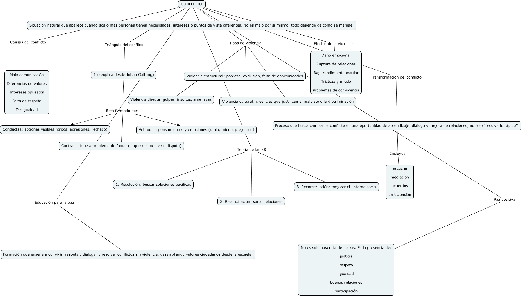 Este Cmap, tiene información relacionada con: Copia de mapa conceptual conflicto, CONFLICTO Tipos de violencia Violencia cultural: creencias que justifican el maltrato o la discriminación, Violencia directa: golpes, insultos, amenazas Tipos de violencia Violencia estructural: pobreza, exclusión, falta de oportunidades, CONFLICTO Paz positiva No es solo ausencia de peleas. Es la presencia de: justicia respeto igualdad buenas relaciones participación, CONFLICTO Teoría de las 3R 1. Resolución: buscar soluciones pacíficas, CONFLICTO Educación para la paz Formación que enseña a convivir, respetar, dialogar y resolver conflictos sin violencia, desarrollando valores ciudadanos desde la escuela., CONFLICTO Causas del conflicto Mala comunicación Diferencias de valores Intereses opuestos Falta de respeto Desigualdad, Situación natural que aparece cuando dos o más personas tienen necesidades, intereses o puntos de vista diferentes. No es malo por sí mismo; todo depende de cómo se maneje. ???? CONFLICTO, CONFLICTO Transformación del conflicto Proceso que busca cambiar el conflicto en una oportunidad de aprendizaje, diálogo y mejora de relaciones, no solo “resolverlo rápido”., CONFLICTO Tipos de violencia Violencia estructural: pobreza, exclusión, falta de oportunidades, (se explica desde Johan Galtung) Está formado por: Contradicciones: problema de fondo (lo que realmente se disputa), CONFLICTO Teoría de las 3R 2. Reconciliación: sanar relaciones, CONFLICTO Triángulo del conflicto (se explica desde Johan Galtung), CONFLICTO Efectos de la violencia Daño emocional Ruptura de relaciones Bajo rendimiento escolar Tristeza y miedo Problemas de convivencia, Proceso que busca cambiar el conflicto en una oportunidad de aprendizaje, diálogo y mejora de relaciones, no solo “resolverlo rápido”. Incluye: escucha mediación acuerdos participación, CONFLICTO Teoría de las 3R 3. Reconstrucción: mejorar el entorno social, Violencia directa: golpes, insultos, amenazas Tipos de violencia Violencia cultural: creencias que justifican el maltrato o la discriminación, (se explica desde Johan Galtung) Está formado por: Actitudes: pensamientos y emociones (rabia, miedo, prejuicios), (se explica desde Johan Galtung) Está formado por: Conductas: acciones visibles (gritos, agresiones, rechazo)