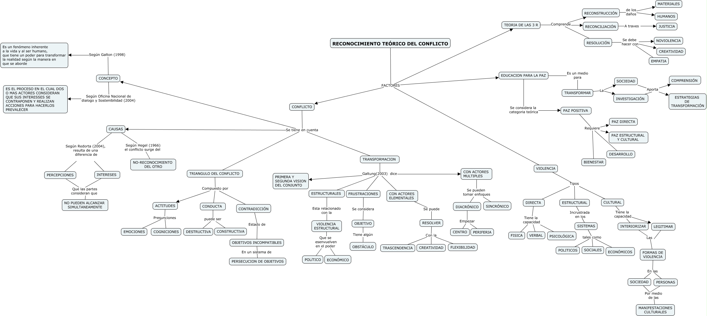 Este Cmap, tiene información relacionada con: RECONOCIMIENTO TEORICO DEL CONFLICTO, SOCIEDAD Por medio de las MANIFESTACIONES CULTURALES, DIRECTA Tiene la capacidad FISICA, TRANSFORMACION Galtung(2003) dice ESTRUCTURALES, CONDUCTA puede ser CONSTRUCTIVA, CULTURAL Tiene la capacidad INTERIORIZAR, PERSONAS Por medio de las MANIFESTACIONES CULTURALES, PAZ POSITIVA Requiere DESARROLLO, RESOLUCIÓN Se debe hacer con NOVIOLENCIA, INTERESES Que las partes consideran que NO PUEDEN ALCANZAR SIMULTANEAMENTE, SOCIEDAD Aporta COMPRENSIÓN, RECONOCIMIENTO TEÓRICO DEL CONFLICTO FACTORES TEORIA DE LAS 3 R, ESTRUCTURALES Esta relacionado con la VIOLENCIA ESTRUCTURAL, PAZ POSITIVA Requiere PAZ DIRECTA, CULTURAL Tiene la capacidad LEGITIMAR, SISTEMAS tales como POLITICOS, TRANSFORMAR La SOCIEDAD, RESOLVER Con la FLEXIBILIDAD, CON ACTORES MULTIPLES Se pueden tomar enfoques DIACRÓNICO, CONDUCTA puede ser DESTRUCTIVA, CONFLICTO Se tiene en cuenta CONCEPTO