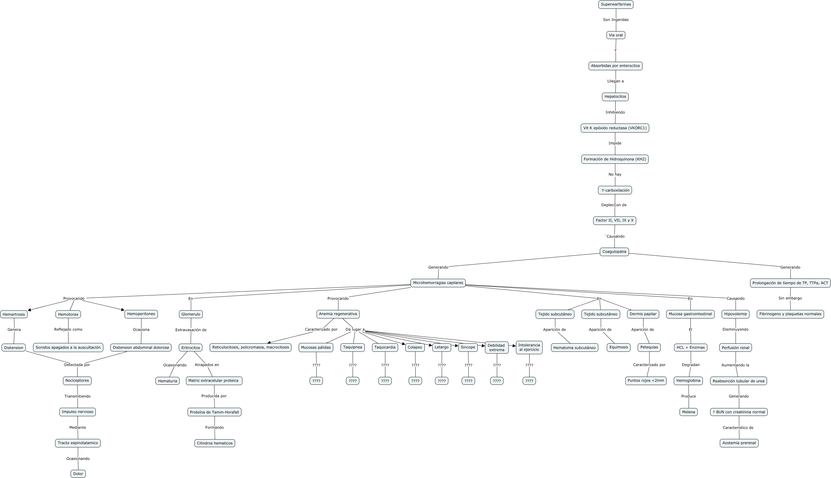 Este Cmap, tiene información relacionada con: superwARFARINAS, Hemartrosis Genera Distension, Letargo ???? ????, Via oral Y Absorbidas por enterocitos, Petequias Caracterizado por Puntos rojos ɚmm, Microhemorragias capilares En Glomerulo, Microhemorragias capilares En Tejido subcutáneo, HCL + Enzimas Degradan Hemoglobina, Distension Detectada por Nociceptores, Eritrocitos Ocasionando Hematuria, Microhemorragias capilares Provocando Anemia regenerativa, Anemia regenerativa Caracterizado por Reticulocitosis, policromasia, macrocitosis, Distension abdominal dolorosa Detectada por Nociceptores, Anemia regenerativa Da lugar a Debilidad extrema, Hepatocitos Inhibiendo Vit K epóxido reductasa (VKORC1), Microhemorragias capilares Provocando Hemartrosis, Microhemorragias capilares En Mucosa gastrointestinal, Hemoperitoneo Ocasiona Distension abdominal dolorosa, Y-carboxilación Depleci[on de Factor II, VII, IX y X, Coagulopatia Generando Microhemorragias capilares, Coagulopatia Generando Prolongación de tiempo de TP, TTPa, ACT