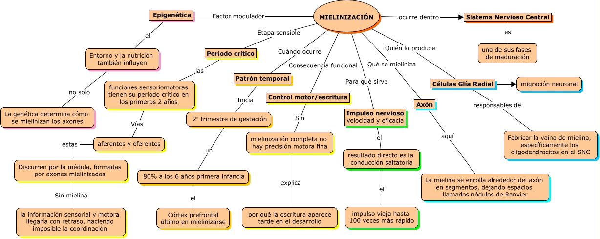 Este Cmap, tiene información relacionada con: MIELINIZACIÓN, MIELINIZACIÓN Factor modulador Epigenética, Control motor/escritura Sin mielinización completa no hay precisión motora fina, MIELINIZACIÓN Para qué sirve Impulso nervioso velocidad y eficacia, Discurren por la médula, formadas por axones mielinizados Sin mielina la información sensorial y motora llegaría con retraso, haciendo imposible la coordinación, MIELINIZACIÓN Cuándo ocurre Patrón temporal, MIELINIZACIÓN Etapa sensible Período crítico, aferentes y eferentes estas Discurren por la médula, formadas por axones mielinizados, Células Glía Radial ???? migración neuronal, Células Glía Radial responsables de Fabricar la vaina de mielina, específicamente los oligodendrocitos en el SNC, mielinización completa no hay precisión motora fina explica por qué la escritura aparece tarde en el desarrollo, Sistema Nervioso Central es una de sus fases de maduración, Epigenética el Entorno y la nutrición también influyen, MIELINIZACIÓN Quién lo produce Células Glía Radial, MIELINIZACIÓN Consecuencia funcional Control motor/escritura, resultado directo es la conducción saltatoria el impulso viaja hasta 100 veces más rápido, 2° trimestre de gestación un 80% a los 6 años primera infancia, 80% a los 6 años primera infancia el Córtex prefrontal último en mielinizarse, Impulso nervioso velocidad y eficacia el resultado directo es la conducción saltatoria, Patrón temporal Inicia 2° trimestre de gestación, funciones sensoriomotoras tienen su periodo critico en los primeros 2 años Vías aferentes y eferentes