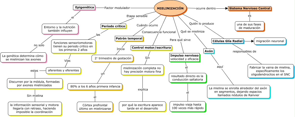 Este Cmap, tiene información relacionada con: MIELINIZACIÓN, MIELINIZACIÓN Factor modulador Epigenética, Control motor/escritura Sin mielinización completa no hay precisión motora fina, MIELINIZACIÓN Para qué sirve Impulso nervioso velocidad y eficacia, Discurren por la médula, formadas por axones mielinizados Sin mielina la información sensorial y motora llegaría con retraso, haciendo imposible la coordinación, MIELINIZACIÓN Cuándo ocurre Patrón temporal, MIELINIZACIÓN Etapa sensible Período crítico, aferentes y eferentes estas Discurren por la médula, formadas por axones mielinizados, Células Glía Radial ???? migración neuronal, Células Glía Radial responsables de Fabricar la vaina de mielina, específicamente los oligodendrocitos en el SNC, mielinización completa no hay precisión motora fina explica por qué la escritura aparece tarde en el desarrollo, Sistema Nervioso Central es una de sus fases de maduración, Epigenética el Entorno y la nutrición también influyen, MIELINIZACIÓN Quién lo produce Células Glía Radial, MIELINIZACIÓN Consecuencia funcional Control motor/escritura, resultado directo es la conducción saltatoria el impulso viaja hasta 100 veces más rápido, 2° trimestre de gestación un 80% a los 6 años primera infancia, 80% a los 6 años primera infancia el Córtex prefrontal último en mielinizarse, Impulso nervioso velocidad y eficacia el resultado directo es la conducción saltatoria, Patrón temporal Inicia 2° trimestre de gestación, funciones sensoriomotoras tienen su periodo critico en los primeros 2 años Vías aferentes y eferentes