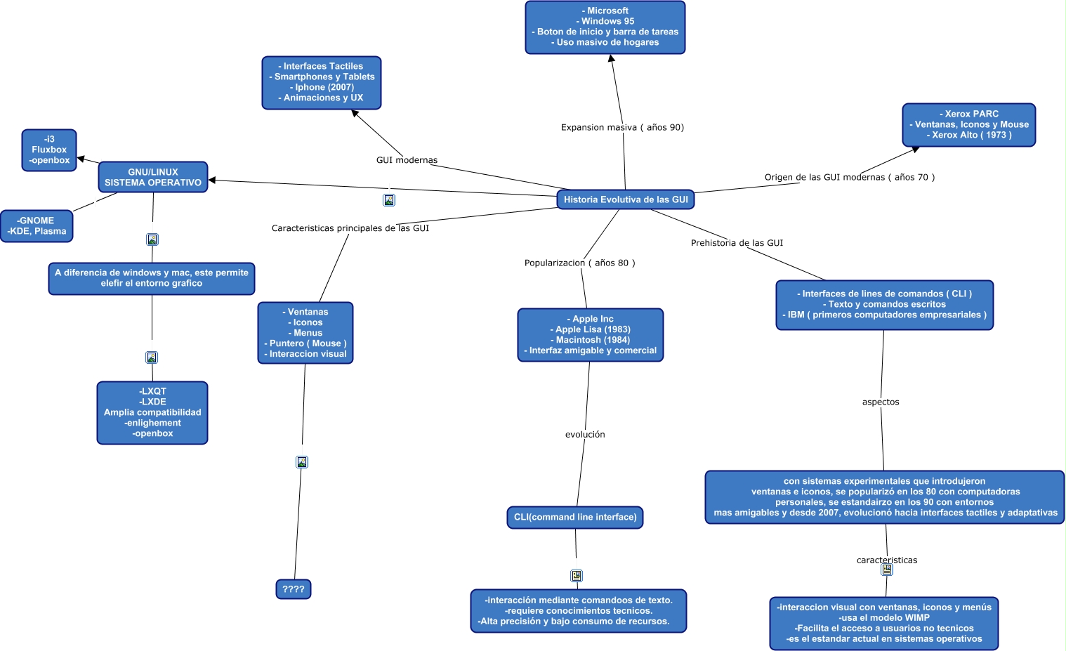 Este Cmap, tiene información relacionada con: trabajo Cmap eileen argoti eraso, Historia Evolutiva de las GUI Popularizacion ( años 80 ) - Apple Inc - Apple Lisa (1983) - Macintosh (1984) - Interfaz amigable y comercial, A diferencia de windows y mac, este permite elefir el entorno grafico -LXQT -LXDE Amplia compatibilidad -enlighement -openbox, CLI(command line interface) -interacción mediante comandoos de texto. -requiere conocimientos tecnicos. -Alta precisión y bajo consumo de recursos., Historia Evolutiva de las GUI Prehistoria de las GUI - Interfaces de lines de comandos ( CLI ) - Texto y comandos escritos - IBM ( primeros computadores empresariales ), GNU/LINUX SISTEMA OPERATIVO -i3 Fluxbox -openbox, - Apple Inc - Apple Lisa (1983) - Macintosh (1984) - Interfaz amigable y comercial evolución CLI(command line interface), - Interfaces de lines de comandos ( CLI ) - Texto y comandos escritos - IBM ( primeros computadores empresariales ) aspectos con sistemas experimentales que introdujeron ventanas e iconos, se popularizó en los 80 con computadoras personales, se estandairzo en los 90 con entornos mas amigables y desde 2007, evolucionó hacia interfaces tactiles y adaptativas, Historia Evolutiva de las GUI Expansion masiva ( años 90) - Microsoft - Windows 95 - Boton de inicio y barra de tareas - Uso masivo de hogares, Historia Evolutiva de las GUI Caracteristicas principales de las GUI - Ventanas - Iconos - Menus - Puntero ( Mouse ) - Interaccion visual, GNU/LINUX SISTEMA OPERATIVO A diferencia de windows y mac, este permite elefir el entorno grafico, con sistemas experimentales que introdujeron ventanas e iconos, se popularizó en los 80 con computadoras personales, se estandairzo en los 90 con entornos mas amigables y desde 2007, evolucionó hacia interfaces tactiles y adaptativas caracteristicas -interaccion visual con ventanas, iconos y menús -usa el modelo WIMP -Facilita el acceso a usuarios no tecnicos -es el estandar actual en sistemas operativos, Historia Evolutiva de las GUI GUI modernas - Interfaces Tactiles - Smartphones y Tablets - Iphone (2007) - Animaciones y UX, Historia Evolutiva de las GUI GNU/LINUX SISTEMA OPERATIVO, - Ventanas - Iconos - Menus - Puntero ( Mouse ) - Interaccion visual ????, GNU/LINUX SISTEMA OPERATIVO -GNOME -KDE, Plasma, Historia Evolutiva de las GUI Origen de las GUI modernas ( años 70 ) - Xerox PARC - Ventanas, Iconos y Mouse - Xerox Alto ( 1973 )