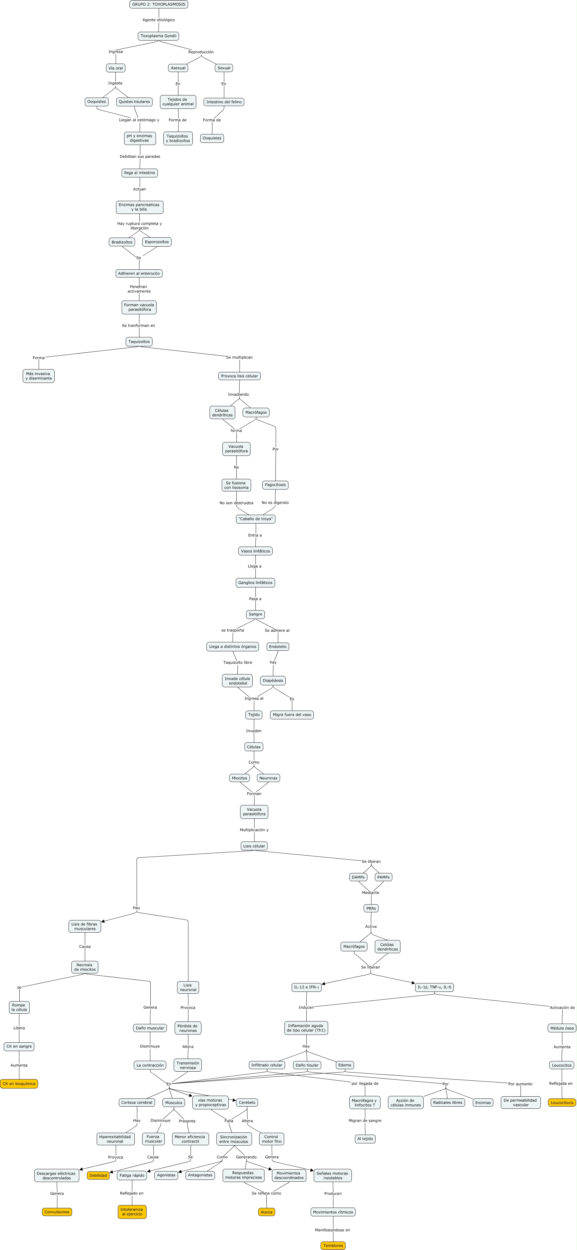 Este Cmap, tiene información relacionada con: Fisios corte 3, Lisis neuronal Provoca Pérdida de neuronas, Sincronización entre músculos Generando Movimientos descoordinados, Vacuola parasitófora No Se fusiona con lisosoma, Neuronas Forman Vacuola parasitófora, Daño muscular Disminuye La contracción, Quistes tisulares Llegan al estómago y pH y enzimas digestivas, Celúlas dendriticas Se liberan IL-12 e IFN-γ, Bradizoítos Se Adhieren al enterocito, Edema En Corteza cerebral, Macrófagos Se liberan IL-12 e IFN-γ, La contracción En Músculos, Macrófagos y linfocitos T Migran de sangre Al tejido, Diapédesis Ingresa al Tejido, vías motoras y propioceptivas Falla Sincronización entre músculos, Ganglios linfáticos Pasa a Sangre, Macrófagos Se liberan IL-1β, TNF-α, IL-6, Enzimas pancreaticas y la bilis Hay ruptura completa y liberaciòn Bradizoítos, Sangre se trasporta Llega a distintos órganos, IL-1β, TNF-α, IL-6 Activación de Médula ósea, Sincronización entre músculos Como Antagonistas