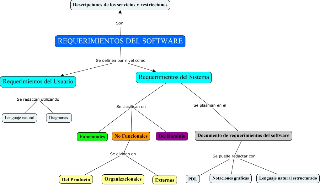 Este Cmap, tiene información relacionada con: Mapa requerimientos, REQUERIMIENTOS DEL SOFTWARE Son Descripciones de los servicios y restricciones, REQUERIMIENTOS DEL SOFTWARE Se definen por nivel como Requerimientos del Sistema, Documento de requerimientos del software Se puede redactar con Notaciones graficas, Documento de requerimientos del software Se puede redactar con PDL, Requerimientos del Sistema Se clasifican en No Funcionales, Requerimientos del Sistema Se clasifican en Del Dominio, Requerimientos del Sistema Se clasifican en Funcionales, Requerimientos del Usuario Se redactan utilizando Diagramas, Requerimientos del Usuario Se redactan utilizando Lenguaje natural, REQUERIMIENTOS DEL SOFTWARE Se definen por nivel como Requerimientos del Usuario, No Funcionales Se dividen en Externos, No Funcionales Se dividen en Organizacionales, Requerimientos del Sistema Se plasman en el Documento de requerimientos del software, No Funcionales Se dividen en Del Producto, Documento de requerimientos del software Se puede redactar con Lenguaje natural estructurado