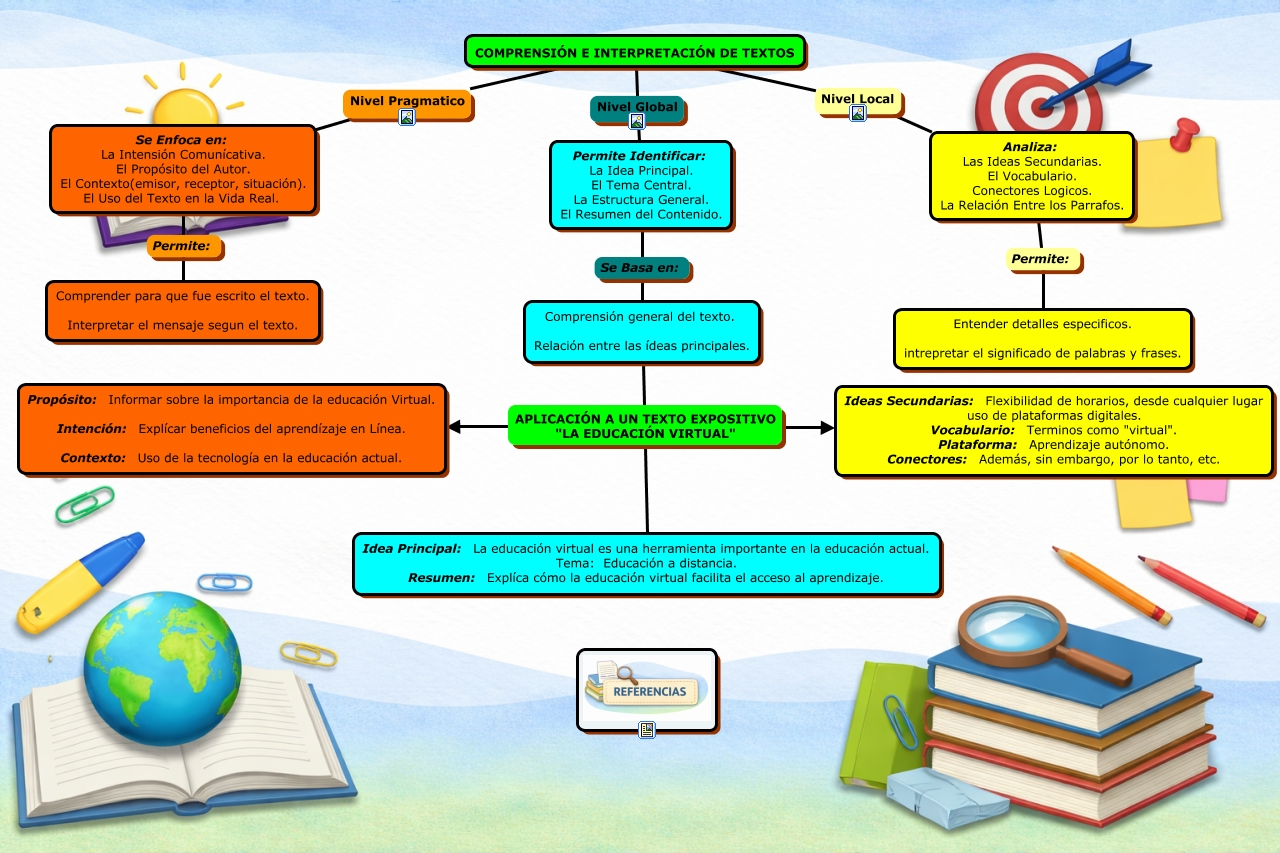 Este Cmap, tiene información relacionada con: Comprensión e Interpretación de textos CIPA10 Unidad 2, Permite Identificar: La Idea Principal. El Tema Central. La Estructura General. El Resumen del Contenido. Se Basa en: Comprensión general del texto. Relación entre las ídeas principales., Analiza: Las Ideas Secundarias. El Vocabulario. Conectores Logicos. La Relación Entre los Parrafos. Permite: Entender detalles especificos. intrepretar el significado de palabras y frases., COMPRENSIÓN E INTERPRETACIÓN DE TEXTOS Nivel Global Permite Identificar: La Idea Principal. El Tema Central. La Estructura General. El Resumen del Contenido., COMPRENSIÓN E INTERPRETACIÓN DE TEXTOS Nivel Local Analiza: Las Ideas Secundarias. El Vocabulario. Conectores Logicos. La Relación Entre los Parrafos., Comprensión general del texto. Relación entre las ídeas principales. APLICACIÓN A UN TEXTO EXPOSITIVO "LA EDUCACIÓN VIRTUAL" Propósito: Informar sobre la importancia de la educación Virtual. Intención: Explícar beneficios del aprendízaje en Línea. Contexto: Uso de la tecnología en la educación actual., Se Enfoca en: La Intensión Comunícativa. El Propósito del Autor. El Contexto(emisor, receptor, situación). El Uso del Texto en la Vida Real. Permite: Comprender para que fue escrito el texto. Interpretar el mensaje segun el texto., Comprensión general del texto. Relación entre las ídeas principales. APLICACIÓN A UN TEXTO EXPOSITIVO "LA EDUCACIÓN VIRTUAL" Idea Principal: La educación virtual es una herramienta importante en la educación actual. Tema: Educación a distancia. Resumen: Explíca cómo la educación virtual facilita el acceso al aprendizaje., Comprensión general del texto. Relación entre las ídeas principales. APLICACIÓN A UN TEXTO EXPOSITIVO "LA EDUCACIÓN VIRTUAL" Ideas Secundarias: Flexibilidad de horarios, desde cualquier lugar uso de plataformas digitales. Vocabulario: Terminos como "virtual". Plataforma: Aprendizaje autónomo. Conectores: Además, sin embargo, por lo tanto, etc., COMPRENSIÓN E INTERPRETACIÓN DE TEXTOS Nivel Pragmatico Se Enfoca en: La Intensión Comunícativa. El Propósito del Autor. El Contexto(emisor, receptor, situación). El Uso del Texto en la Vida Real.