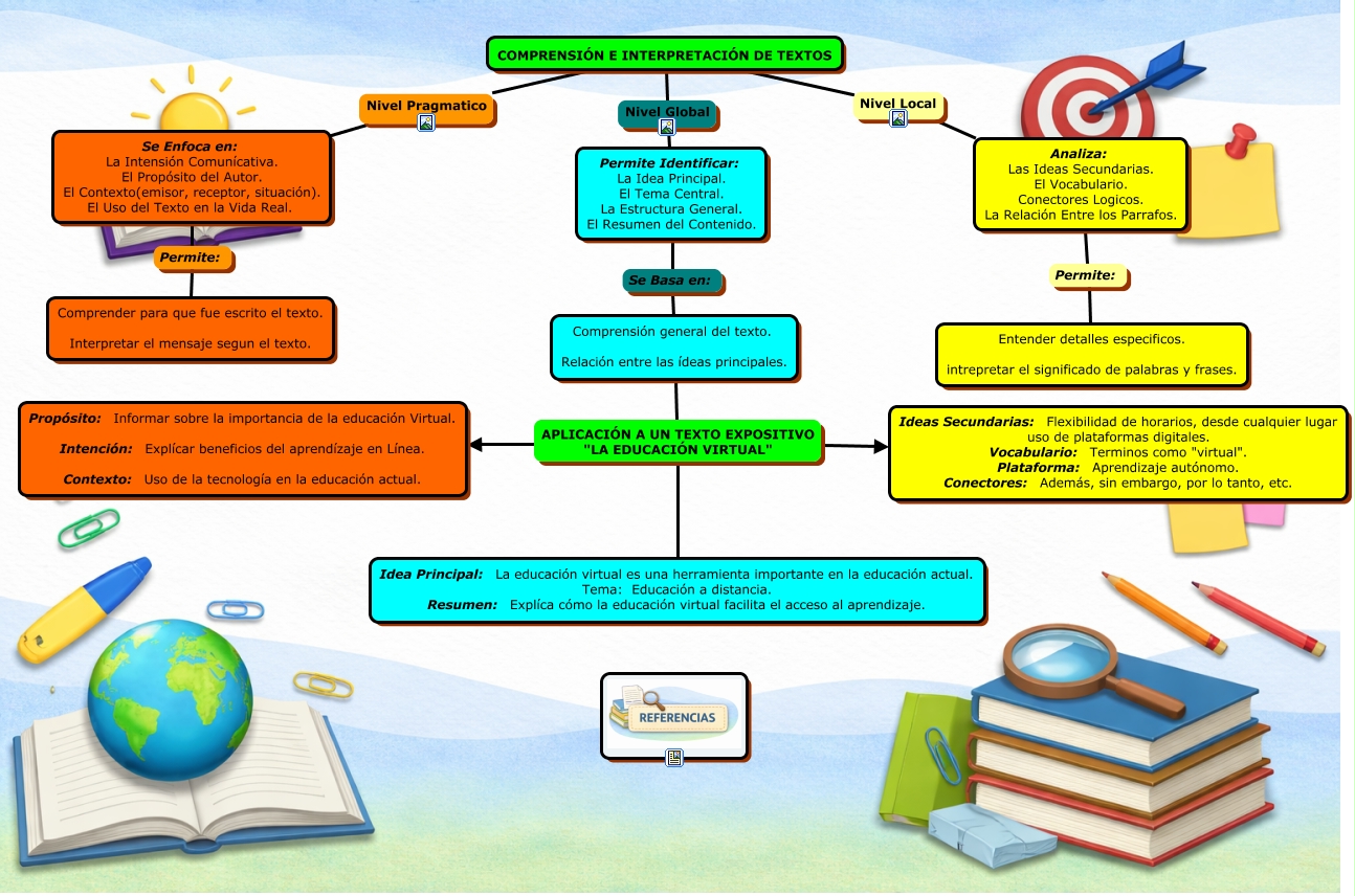 Este Cmap, tiene información relacionada con: ACTIVIDAD, Permite Identificar: La Idea Principal. El Tema Central. La Estructura General. El Resumen del Contenido. Se Basa en: Comprensión general del texto. Relación entre las ídeas principales., Analiza: Las Ideas Secundarias. El Vocabulario. Conectores Logicos. La Relación Entre los Parrafos. Permite: Entender detalles especificos. intrepretar el significado de palabras y frases., COMPRENSIÓN E INTERPRETACIÓN DE TEXTOS Nivel Global Permite Identificar: La Idea Principal. El Tema Central. La Estructura General. El Resumen del Contenido., COMPRENSIÓN E INTERPRETACIÓN DE TEXTOS Nivel Local Analiza: Las Ideas Secundarias. El Vocabulario. Conectores Logicos. La Relación Entre los Parrafos., Comprensión general del texto. Relación entre las ídeas principales. APLICACIÓN A UN TEXTO EXPOSITIVO "LA EDUCACIÓN VIRTUAL" Propósito: Informar sobre la importancia de la educación Virtual. Intención: Explícar beneficios del aprendízaje en Línea. Contexto: Uso de la tecnología en la educación actual., Se Enfoca en: La Intensión Comunícativa. El Propósito del Autor. El Contexto(emisor, receptor, situación). El Uso del Texto en la Vida Real. Permite: Comprender para que fue escrito el texto. Interpretar el mensaje segun el texto., Comprensión general del texto. Relación entre las ídeas principales. APLICACIÓN A UN TEXTO EXPOSITIVO "LA EDUCACIÓN VIRTUAL" Idea Principal: La educación virtual es una herramienta importante en la educación actual. Tema: Educación a distancia. Resumen: Explíca cómo la educación virtual facilita el acceso al aprendizaje., Comprensión general del texto. Relación entre las ídeas principales. APLICACIÓN A UN TEXTO EXPOSITIVO "LA EDUCACIÓN VIRTUAL" Ideas Secundarias: Flexibilidad de horarios, desde cualquier lugar uso de plataformas digitales. Vocabulario: Terminos como "virtual". Plataforma: Aprendizaje autónomo. Conectores: Además, sin embargo, por lo tanto, etc., COMPRENSIÓN E INTERPRETACIÓN DE TEXTOS Nivel Pragmatico Se Enfoca en: La Intensión Comunícativa. El Propósito del Autor. El Contexto(emisor, receptor, situación). El Uso del Texto en la Vida Real.
