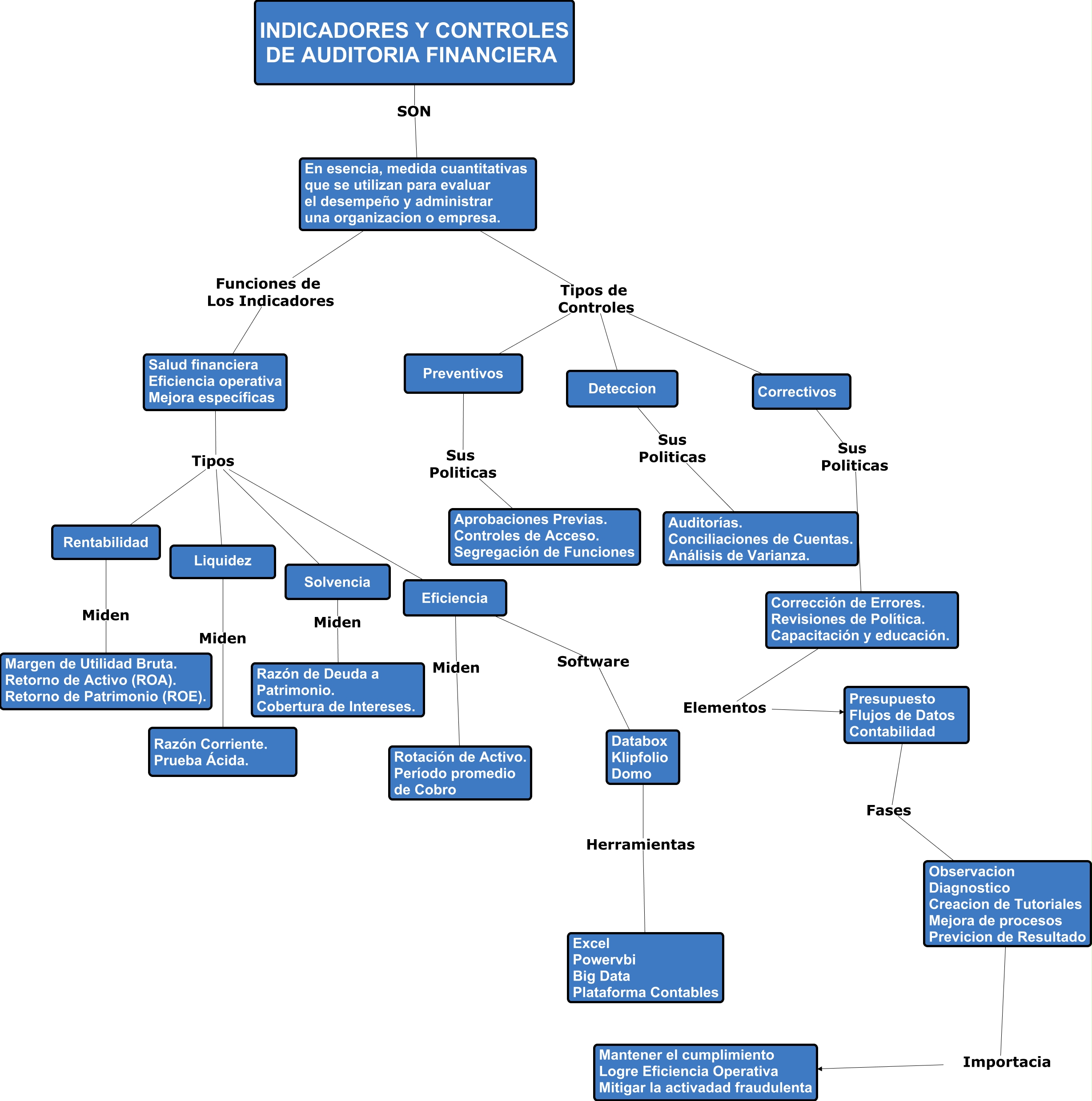 Este Cmap, tiene información relacionada con: Copia de INDICADORE Y CONTROLES FINANCIEROS, Deteccion Sus Politicas Auditorías. Conciliaciones de Cuentas. Análisis de Varianza., Rentabilidad Miden Margen de Utilidad Bruta. Retorno de Activo (ROA). Retorno de Patrimonio (ROE)., Solvencia Miden Razón de Deuda a Patrimonio. Cobertura de Intereses., En esencia, medida cuantitativas que se utilizan para evaluar el desempeño y administrar una organizacion o empresa. Funciones de Los Indicadores Salud financiera Eficiencia operativa Mejora específicas, Liquidez Miden Razón Corriente. Prueba Ácida., Salud financiera Eficiencia operativa Mejora específicas Tipos Rentabilidad, Salud financiera Eficiencia operativa Mejora específicas Tipos Eficiencia, Preventivos Sus Politicas Aprobaciones Previas. Controles de Acceso. Segregación de Funciones, Corrección de Errores. Revisiones de Política. Capacitación y educación. Elementos Presupuesto Flujos de Datos Contabilidad, Eficiencia Miden Rotación de Activo. Período promedio de Cobro, Eficiencia Software Databox Klipfolio Domo, En esencia, medida cuantitativas que se utilizan para evaluar el desempeño y administrar una organizacion o empresa. Tipos de Controles Preventivos, Databox Klipfolio Domo Herramientas Excel Powervbi Big Data Plataforma Contables, INDICADORES Y CONTROLES DE AUDITORIA FINANCIERA SON En esencia, medida cuantitativas que se utilizan para evaluar el desempeño y administrar una organizacion o empresa., Presupuesto Flujos de Datos Contabilidad Fases Observacion Diagnostico Creacion de Tutoriales Mejora de procesos Previcion de Resultado, Correctivos Sus Politicas Corrección de Errores. Revisiones de Política. Capacitación y educación., En esencia, medida cuantitativas que se utilizan para evaluar el desempeño y administrar una organizacion o empresa. Tipos de Controles Correctivos, En esencia, medida cuantitativas que se utilizan para evaluar el desempeño y administrar una organizacion o empresa. Tipos de Controles Deteccion, Salud financiera Eficiencia operativa Mejora específicas Tipos Liquidez, Observacion Diagnostico Creacion de Tutoriales Mejora de procesos Previcion de Resultado Importacia Mantener el cumplimiento Logre Eficiencia Operativa Mitigar la activadad fraudulenta