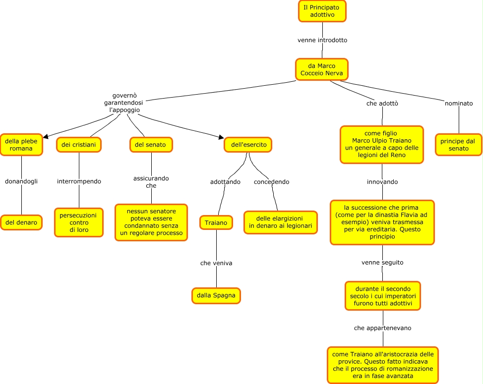 Questa Cmap, creata con IHMC CmapTools, contiene informazioni relative a: Il Principato adottivo, dei cristiani interrompendo persecuzioni contro di loro, da Marco Cocceio Nerva nominato principe dal senato, del senato assicurando che nessun senatore poteva essere condannato senza un regolare processo, da Marco Cocceio Nerva governò garantendosi l'appoggio del senato, da Marco Cocceio Nerva governò garantendosi l'appoggio dei cristiani, la successione che prima (come per la dinastia Flavia ad esempio) veniva trasmessa per via ereditaria. Questo principio venne seguito durante il secondo secolo i cui imperatori furono tutti adottivi, durante il secondo secolo i cui imperatori furono tutti adottivi che appartenevano come Traiano all'aristocrazia delle provice. Questo fatto indicava che il processo di romanizzazione era in fase avanzata, come figlio Marco Ulpio Traiano un generale a capo delle legioni del Reno innovando la successione che prima (come per la dinastia Flavia ad esempio) veniva trasmessa per via ereditaria. Questo principio, da Marco Cocceio Nerva governò garantendosi l'appoggio dell'esercito, Traiano che veniva dalla Spagna, della plebe romana donandogli del denaro, dell'esercito concedendo delle elargizioni in denaro ai legionari, da Marco Cocceio Nerva che adottò come figlio Marco Ulpio Traiano un generale a capo delle legioni del Reno, da Marco Cocceio Nerva governò garantendosi l'appoggio della plebe romana, Il Principato adottivo venne introdotto da Marco Cocceio Nerva, dell'esercito adottando Traiano