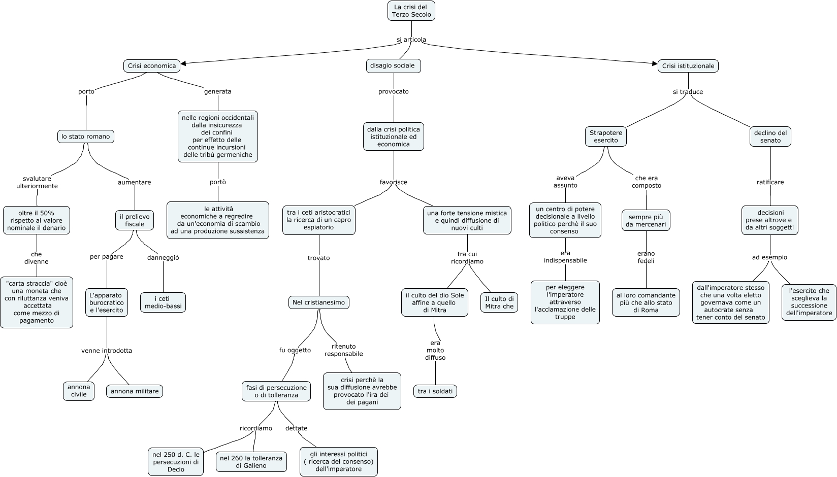 Questa Cmap, creata con IHMC CmapTools, contiene informazioni relative a: La crisi del terzo secolo, declino del senato ratificare decisioni prese altrove e da altri soggetti, fasi di persecuzione o di tolleranza ricordiamo nel 250 d. C. le persecuzioni di Decio, Crisi istituzionale si traduce declino del senato, il culto del dio Sole affine a quello di Mitra era molto diffuso tra i soldati, Crisi istituzionale si traduce Strapotere esercito, lo stato romano aumentare il prelievo fiscale, Crisi economica generata nelle regioni occidentali dalla insicurezza dei confini per effetto delle continue incursioni delle tribù germeniche, sempre più da mercenari erano fedeli al loro comandante più che allo stato di Roma, il prelievo fiscale danneggiò i ceti medio-bassi, oltre il 50% rispetto al valore nominale il denario che divenne "carta straccia" cioè una moneta che con riluttanza veniva accettata come mezzo di pagamento, una forte tensione mistica e quindi diffusione di nuovi culti tra cui ricordiamo il culto del dio Sole affine a quello di Mitra, dalla crisi politica istituzionale ed economica favorisce tra i ceti aristocratici la ricerca di un capro espiatorio, fasi di persecuzione o di tolleranza ricordiamo nel 260 la tolleranza di Galieno, decisioni prese altrove e da altri soggetti ad esempio l'esercito che sceglieva la successione dell'imperatore, dalla crisi politica istituzionale ed economica favorisce una forte tensione mistica e quindi diffusione di nuovi culti, Strapotere esercito che era composto sempre più da mercenari, Nel cristianesimo fu oggetto fasi di persecuzione o di tolleranza, Crisi economica porto lo stato romano, lo stato romano svalutare ulteriormente oltre il 50% rispetto al valore nominale il denario, La crisi del Terzo Secolo si articola disagio sociale