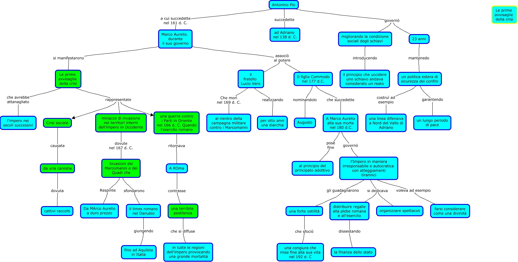 Questa Cmap, creata con IHMC CmapTools, contiene informazioni relative a: Le prime avvisaglie della crisi, l'Impero in maniera irresponsabile e autocratica con atteggiamenti tirannici si dedicava distribuire regalie alla plebe romana e all'esercito, l'Impero in maniera irresponsabile e autocratica con atteggiamenti tirannici voleva ad esempio farsi considerare come una divinità, Invasioni dei Marcomanni e dei Quadi che Respinte Da MArco Aurelio a duro prezzo, un politica estera di sicurezza dei confini garantendo un lungo periodo di pace, una forte ostilità che sfociò una congiura che mise fine alla sua vita nel 192 d. C, A Marco Aurelio alla sua morte nel 180 d.C. governò l'Impero in maniera irresponsabile e autocratica con atteggiamenti tirannici, il limes romano nel Danubio giungendo fino ad Aquileia in Italia, l'Impero in maniera irresponsabile e autocratica con atteggiamenti tirannici si dedicava organizzare spettacoli, minacce di invasione nei territori interni dell'impero in Occidente dovute nel 167 d. C. Invasioni dei Marcomanni e dei Quadi che, Crisi sociale causata da una carestia, Le prime avvisaglie della crisi rappresentate minacce di invasione nei territori interni dell'impero in Occidente, da una carestia dovuta cattivi raccolti, Antonino Pio succedette ad Adriano nel 138 d. C., una terribile pestilenza che si diffuse in tutte le regioni dell'impero provocando una grande mortalità, Invasioni dei Marcomanni e dei Quadi che sfondarono il limes romano nel Danubio, distribuire regalie alla plebe romana e all'esercito dissestando la finanza dello stato, una guerra contro i Parti in Oriente nel 166 d. C. Quando l'esercito romano ritornava A ROma, Antonino Pio governò migliorando la condizione sociali degli schiavi, l'Impero in maniera irresponsabile e autocratica con atteggiamenti tirannici gli guadagnarono una forte ostilità, il fratello Lucio Vero Che morì nel 169 d. C. al rientro della campagna militare contro i Marcomanni