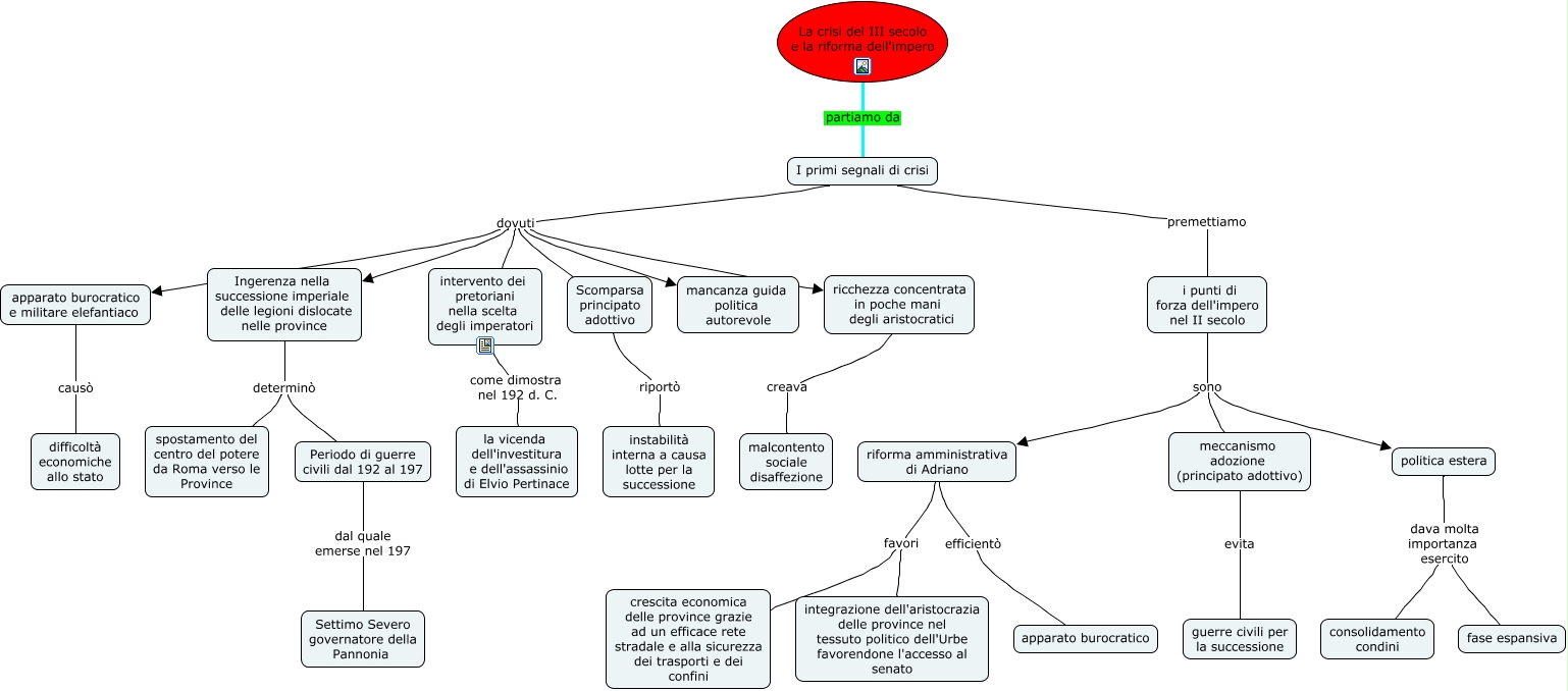 Questa Cmap, creata con IHMC CmapTools, contiene informazioni relative a: La crisi del secondo secolo I, riforma amministrativa di Adriano efficientò apparato burocratico, I primi segnali di crisi dovuti intervento dei pretoriani nella scelta degli imperatori, apparato burocratico e militare elefantiaco causò difficoltà economiche allo stato, ricchezza concentrata in poche mani degli aristocratici creava malcontento sociale disaffezione, riforma amministrativa di Adriano favori crescita economica delle province grazie ad un efficace rete stradale e alla sicurezza dei trasporti e dei confini, politica estera dava molta importanza esercito fase espansiva, intervento dei pretoriani nella scelta degli imperatori come dimostra nel 192 d. C. la vicenda dell'investitura e dell'assassinio di Elvio Pertinace, riforma amministrativa di Adriano favori integrazione dell'aristocrazia delle province nel tessuto politico dell'Urbe favorendone l'accesso al senato, Ingerenza nella successione imperiale delle legioni dislocate nelle province determinò Periodo di guerre civili dal 192 al 197, Periodo di guerre civili dal 192 al 197 dal quale emerse nel 197 Settimo Severo governatore della Pannonia, i punti di forza dell'impero nel II secolo sono politica estera, I primi segnali di crisi dovuti ricchezza concentrata in poche mani degli aristocratici, I primi segnali di crisi dovuti Ingerenza nella successione imperiale delle legioni dislocate nelle province, I primi segnali di crisi dovuti apparato burocratico e militare elefantiaco, Ingerenza nella successione imperiale delle legioni dislocate nelle province determinò spostamento del centro del potere da Roma verso le Province, I primi segnali di crisi dovuti Scomparsa principato adottivo, meccanismo adozione (principato adottivo) evita guerre civili per la successione, Scomparsa principato adottivo riportò instabilità interna a causa lotte per la successione, i punti di forza dell'impero nel II secolo sono meccanismo adozione (principato adottivo), politica estera dava molta importanza esercito consolidamento condini