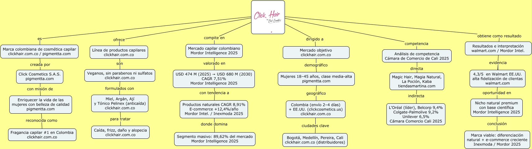 Este Cmap, tiene información relacionada con: fundamentos de mercadeo lhia castro, Mujeres 18–45 años, clase media-alta pigmentta.com geográfico Colombia (envío 2–4 días) + EE.UU. (clickcosmetics.us) clickhair.com.co, Resultados e interpretación walmart.com / Mordor Intel. evidencia 4,3/5 en Walmart EE.UU. alta fidelización de clientas walmart.com, 4,3/5 en Walmart EE.UU. alta fidelización de clientas walmart.com oportunidad en Nicho natural premium con base científica Mordor Intelligence 2025, ssssssssssssss sssssssssss es Marca colombiana de cosmética capilar clickhair.com.co / pigmentta.com, ssssssssssssss sssssssssss obtiene como resultado Resultados e interpretación walmart.com / Mordor Intel., Mercado objetivo clickhair.com.co demográfico Mujeres 18–45 años, clase media-alta pigmentta.com, Enriquecer la vida de las mujeres con belleza de calidad pigmentta.com reconocida como Fragancia capilar #1 en Colombia clickhair.com.co, Productos naturales CAGR 8,91% E-commerce +12,4%/año Mordor Intel. / Inexmoda 2025 donde domina Segmento masivo: 89,62% del mercado Mordor Intelligence 2025, Miel, Argán, Ají y Tónico Pelinex (anticaída) clickhair.com.co para tratar Caída, frizz, daño y alopecia clickhair.com.co, Línea de productos capilares clickhair.com.co son Veganos, sin parabenos ni sulfatos clickhair.com.co, Veganos, sin parabenos ni sulfatos clickhair.com.co formulados con Miel, Argán, Ají y Tónico Pelinex (anticaída) clickhair.com.co, ssssssssssssss sssssssssss competencia Análisis de competencia Cámara de Comercio de Cali 2025, Magic Hair, Magia Natural, La Poción, Kaba tiendasmartina.com indirecta L'Oréal (líder), Belcorp 9,4% Colgate-Palmolive 9,2% Unilever 6,5% Cámara Comercio Cali 2025, ssssssssssssss sssssssssss ofrece Línea de productos capilares clickhair.com.co, ssssssssssssss sssssssssss dirigido a Mercado objetivo clickhair.com.co, Marca colombiana de cosmética capilar clickhair.com.co / pigmentta.com creada por Click Cosmetics S.A.S. pigmentta.com, ssssssssssssss sssssssssss compite en Mercado capilar colombiano Mordor Intelligence 2025, Nicho natural premium con base científica Mordor Intelligence 2025 conclusión Marca viable: diferenciación natural + e-commerce creciente Inexmoda / Mordor 2025, Análisis de competencia Cámara de Comercio de Cali 2025 directa Magic Hair, Magia Natural, La Poción, Kaba tiendasmartina.com, Mercado capilar colombiano Mordor Intelligence 2025 valorado en USD 474 M (2025) → USD 680 M (2030) CAGR 7,51% Mordor Intelligence 2025