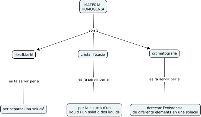 Este Cmap, tiene información relacionada con: Matèria Homogènia, MATÈRIA HOMOGÈNIA són 3 cromatografia, destil.lació es fa servir per a per separar una solució, MATÈRIA HOMOGÈNIA són 3 destil.lació, MATÈRIA HOMOGÈNIA són 3 cristal.litcació, cromatografia es fa servir per a detectar l'existencia de diferents elements en una solucio, cristal.litcació es fa servir per a per la solució d'un líquid i un solid o dos líquids