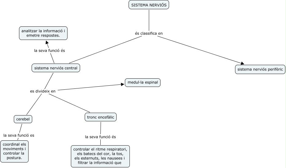 Este Cmap, tiene información relacionada con: 未命名 2, sistema nerviós central es divideix en tronc encefàlic, SISTEMA NERVIÓS és classifica en sistema nerviós central, cerebel la seva funció es coordinal els moviments i controlar la postura., sistema nerviós central es divideix en cerebel, SISTEMA NERVIÓS és classifica en sistema nerviós perifèric, tronc encefàlic la seva funció és controlar el ritme respiratori, els batecs del cor, la tos, els esternuts, les nausees i filtrar la informació que, sistema nerviós central es divideix en medul·la espinal, sistema nerviós central la seva funció és analitzar la informació i emetre respostes.
