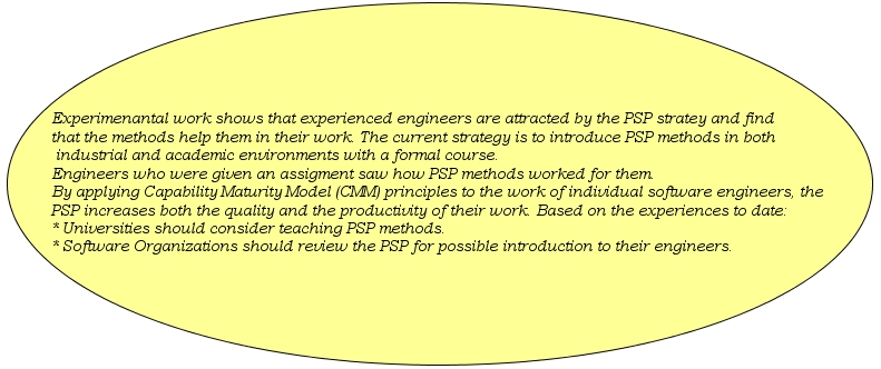 psp status, experimenantal work shows that experienced engineers are attracted by the psp stratey and find that the methods help them in their work. the current strategy is to introduce psp methods in both industrial and academic environments with a formal course. engineers who were given an assigment saw how psp methods worked for them. by applying capability maturity model (cmm) principles to the work of individual software engineers, the psp increases both the quality and the productivity of their work. based on the experiences to date universities should consider teaching psp methods. software organizations should review the psp for possible introduction to their engineers.