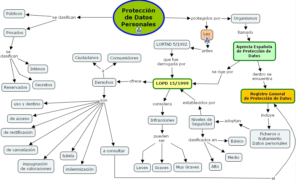 Derechos son indemnizaci�n, Derechos son tutela, Derechos son uso y destino, Derechos son a consultar , Derechos son de rectificaci�n, Derechos son de acceso, Derechos son de cancelaci�n, Derechos son impugnaci�n de valoraciones, Niveles de Seguridad establecidos por LOPD 15/1999, Agencia Espa�ola de Protecci�n de Datos se rige por LOPD 15/1999, Registro General de Protecci�n de Datos incluye Ficheros o tratamiento Datos personales, LOPD 15/1999 ofrece Derechos, Organismos llamado Agencia Espa�ola de Protecci�n de Datos, a consultar el Registro General de Protecci�n de Datos, Niveles de Seguridad clasificados en Alto, Niveles de Seguridad clasificados en Medio, Niveles de Seguridad clasificados en B�sico, Ficheros o tratamiento Datos personales adoptan Niveles de Seguridad, LOPD 15/1999 considera Infracciones, Infracciones pueden ser Leves, Infracciones pueden ser Graves, Infracciones pueden ser Muy Graves, Derechos a Ciudadanos, Derechos a Consumidores, Agencia Espa�ola de Protecci�n de Datos dentro se encuentra Registro General de Protecci�n de Datos, Protecci�n de Datos Personales se clasifican Privados, Protecci�n de Datos Personales se clasifican P�blicos, Protecci�n de Datos Personales protegidos por Organismos, Protecci�n de Datos Personales protegidos por Ley, Privados se clasifican Secretos, Privados se clasifican Intimos, Privados se clasifican Reservados, LORTAD 5/1992 que fue derrogada por LOPD 15/1999, Ley antes LORTAD 5/1992