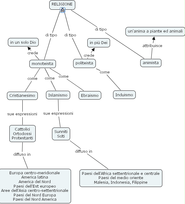 monoteista come Ebraismo, Islamismo sue espressioni Sunniti Sciti, monoteista come Islamismo, monoteista come Cristianesimo, animista attribuisce un'anima a piante ed animali, monoteista crede in un solo Dio, Cristianesimo sue espressioni Cattolici Ortodossi Protestanti, Cattolici Ortodossi Protestanti diffuso in Europa centro-meridionale America latina America del Nord Paesi dell'Est europeo Aree dell'Asia centro-settentrionale Paesi del Nord Europa Paesi del Nord America, politeista come Induismo, politeista crede in pi� Dei, RELIGIONE di tipo politeista, Sunniti Sciti diffuso in Paesi dell'Africa settentrionale e centrale Paesi del medio oriente Malesia, Indonesia, Filippine, RELIGIONE di tipo animista, RELIGIONE di tipo monoteista