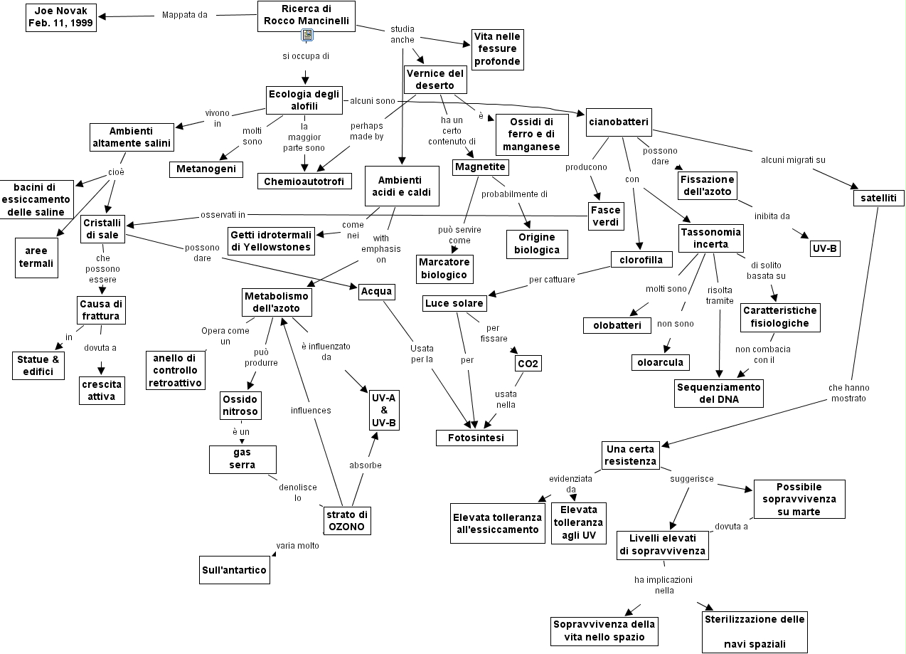 Cristalli di sale che possono essere Causa di frattura, Causa di frattura in Statue & edifici, Una certa resistenza suggerisce Possibile sopravvivenza su marte, Una certa resistenza suggerisce Livelli elevati di sopravvivenza, satelliti che hanno mostrato Una certa resistenza, CO2 usata nella Fotosintesi, Metabolismo dell'azoto � influenzato da UV-A & UV-B, cianobatteri possono dare Fissazione dell'azoto, Ossido nitroso � un gas serra, Ecologia degli alofili alcuni sono cianobatteri, Magnetite probabilmente di Origine biologica, Fissazione dell'azoto inibita da UV-B, Tassonomia incerta risolta tramite Sequenziamento del DNA, strato di OZONO absorbe UV-A & UV-B, Vernice del deserto � Ossidi di ferro e di manganese, Cristalli di sale possono dare Acqua, Possibile sopravvivenza su marte dovuta a Livelli elevati di sopravvivenza, Vernice del deserto ha un certo contenuto di Magnetite, Causa di frattura dovuta a crescita attiva, Ambienti acidi e caldi with emphasis on Metabolismo dell'azoto, Tassonomia incerta non sono oloarcula, Tassonomia incerta di solito basata su Caratteristiche fisiologiche, strato di OZONO influences Metabolismo dell'azoto, Magnetite pu� servire come Marcatore biologico, gas serra denolisce lo strato di OZONO, Caratteristiche fisiologiche non combacia con il Sequenziamento del DNA, Luce solare per fissare CO2, Una certa resistenza evidenziata da Elevata tolleranza all'essiccamento, Una certa resistenza evidenziata da Elevata tolleranza agli UV, Ricerca di Rocco Mancinelli studia anche Ambienti acidi e caldi, Ricerca di Rocco Mancinelli studia anche Vita nelle fessure profonde, Ricerca di Rocco Mancinelli studia anche Vernice del deserto, Ricerca di Rocco Mancinelli si occupa di Ecologia degli alofili, Vernice del deserto perhaps made by Chemioautotrofi, Ambienti altamente salini cio� bacini di essiccamento delle saline, Ambienti altamente salini cio� Cristalli di sale, Ambienti altamente salini cio� aree termali, cianobatteri con Tassonomia incerta, cianobatteri con clorofilla, Luce solare per Fotosintesi, strato di OZONO varia molto Sull'antartico, Ecologia degli alofili la maggior parte sono Chemioautotrofi, cianobatteri alcuni migrati su satelliti, Ecologia degli alofili molti sono Metanogeni, Ecologia degli alofili vivono in Ambienti altamente salini, Fasce verdi osservati in Cristalli di sale, clorofilla per cattuare Luce solare, Tassonomia incerta molti sono olobatteri, Metabolismo dell'azoto Opera come un anello di controllo retroattivo, Ricerca di Rocco Mancinelli Mappata da Joe Novak Feb. 11, 1999, Metabolismo dell'azoto pu� produrre Ossido nitroso, Ambienti acidi e caldi come nei Getti idrotermali di Yellowstones, Acqua Usata per la Fotosintesi, Livelli elevati di sopravvivenza ha implicazioni nella Sterilizzazione delle navi spaziali, Livelli elevati di sopravvivenza ha implicazioni nella Sopravvivenza della vita nello spazio, cianobatteri producono Fasce verdi