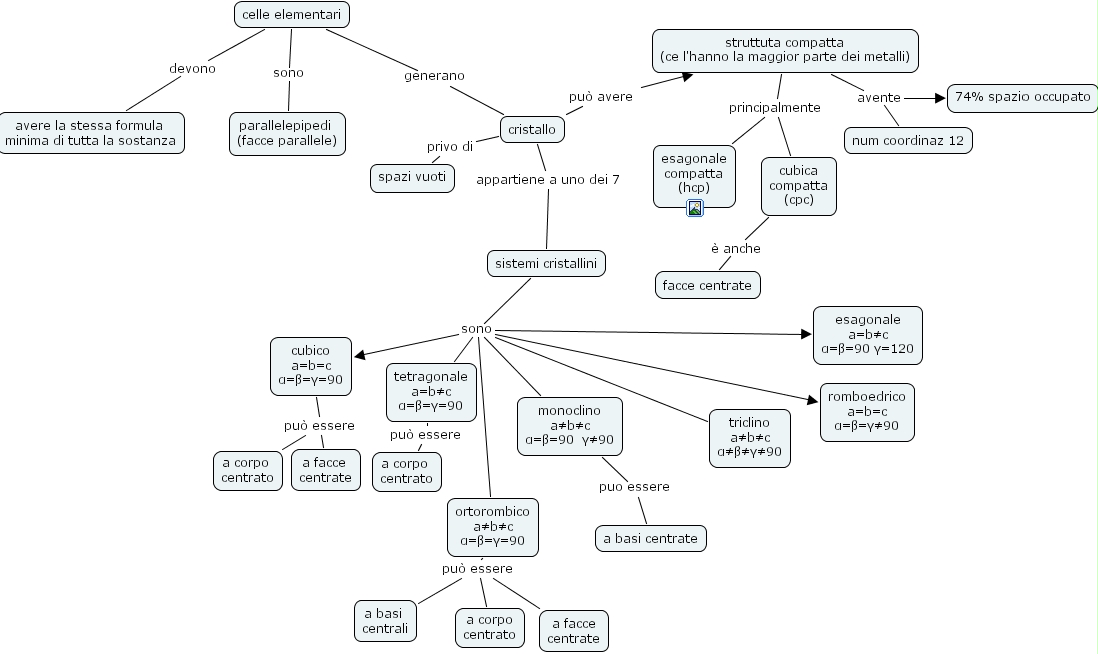 cubica compatta (cpc) � anche facce centrate, struttuta compatta (ce l'hanno la maggior parte dei metalli) avente 74% spazio occupato, struttuta compatta (ce l'hanno la maggior parte dei metalli) avente num coordinaz 12, tetragonale a=b?c ?=?=?=90 pu� essere a corpo centrato, cubico a=b=c ?=?=?=90 pu� essere a facce centrate, cubico a=b=c ?=?=?=90 pu� essere a corpo centrato, sistemi cristallini sono triclino a?b?c ??????90, sistemi cristallini sono ortorombico a?b?c ?=?=?=90, sistemi cristallini sono esagonale a=b?c ?=?=90 ?=120, sistemi cristallini sono romboedrico a=b=c ?=?=??90, sistemi cristallini sono monoclino a?b?c ?=?=90 ??90, sistemi cristallini sono cubico a=b=c ?=?=?=90, sistemi cristallini sono tetragonale a=b?c ?=?=?=90, monoclino a?b?c ?=?=90 ??90 puo essere a basi centrate, struttuta compatta (ce l'hanno la maggior parte dei metalli) principalmente esagonale compatta (hcp), struttuta compatta (ce l'hanno la maggior parte dei metalli) principalmente cubica compatta (cpc), ortorombico a?b?c ?=?=?=90 pu� essere a corpo centrato, ortorombico a?b?c ?=?=?=90 pu� essere a basi centrali, ortorombico a?b?c ?=?=?=90 pu� essere a facce centrate, cristallo appartiene a uno dei 7 sistemi cristallini, celle elementari generano cristallo, cristallo privo di spazi vuoti, celle elementari sono parallelepipedi (facce parallele), celle elementari devono avere la stessa formula minima di tutta la sostanza, cristallo pu� avere struttuta compatta (ce l'hanno la maggior parte dei metalli)