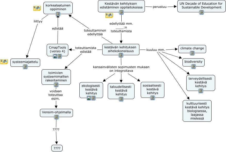 KEKE_14.10.05, kestävän kehityksen aihekokonaisuus toteuttamista edistää CmapTools (versio 4), korkealaatuinen oppiminen liittyy systeemiajattelu, kestävän kehityksen aihekokonaisuus kuuluu mm. climate change, kestävän kehityksen aihekokonaisuus kuuluu mm. kulttuurisesti kestävä kehitys biologisessa, laajassa mielessä, kestävän kehityksen aihekokonaisuus toteuttamista edistää toimivien systeemimallien rakentaminen, kestävän kehityksen aihekokonaisuus kansainvälisten sopimusten mukaan on integroitava ekologisesti kestävä kehitys, Vensim-ohjelmalla ???? ????, toimivien systeemimallien rakentaminen voidaan toteuttaa esim. Vensim-ohjelmalla, kestävän kehityksen aihekokonaisuus kansainvälisten sopimusten mukaan on integroitava sosiaalisesti kestävä kehitys, Kestävän kehityksen edistäminen oppilaitoksissa perustuu UN Decade of Education for Sustainable Development